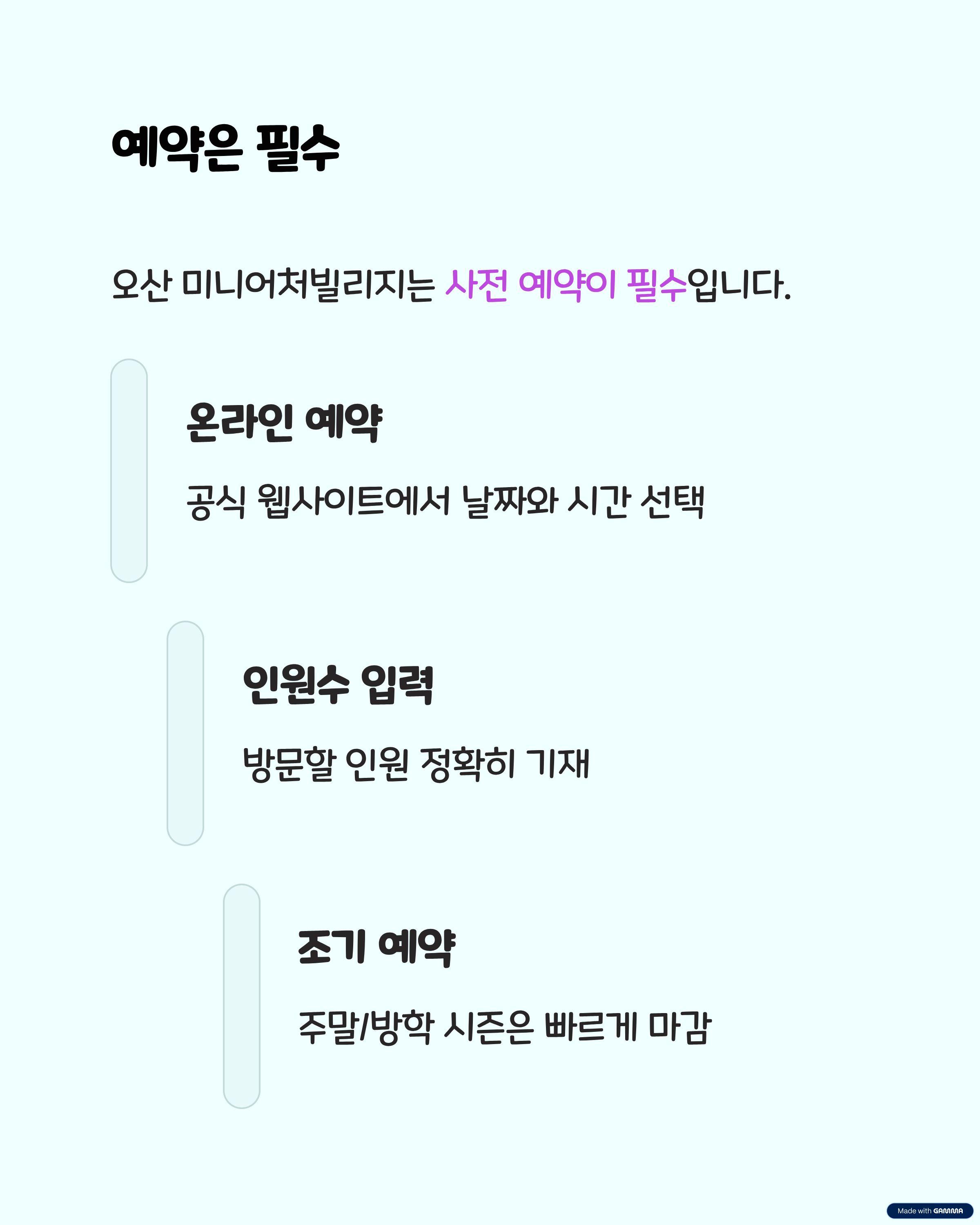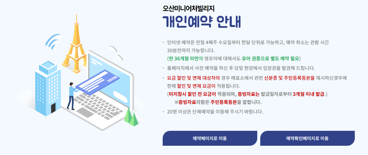 오산 미니어처빌리지는 사전 예약이 필수입니다. 온라인 예약 페이지에서 원하는 날짜와 시간을 선택한 후 인원수를 입력하면 간단하게 예약이 완료됩니다. 주말이나 방학 시즌에는 금세 마감되니 미리 예약하는 게 좋아요.