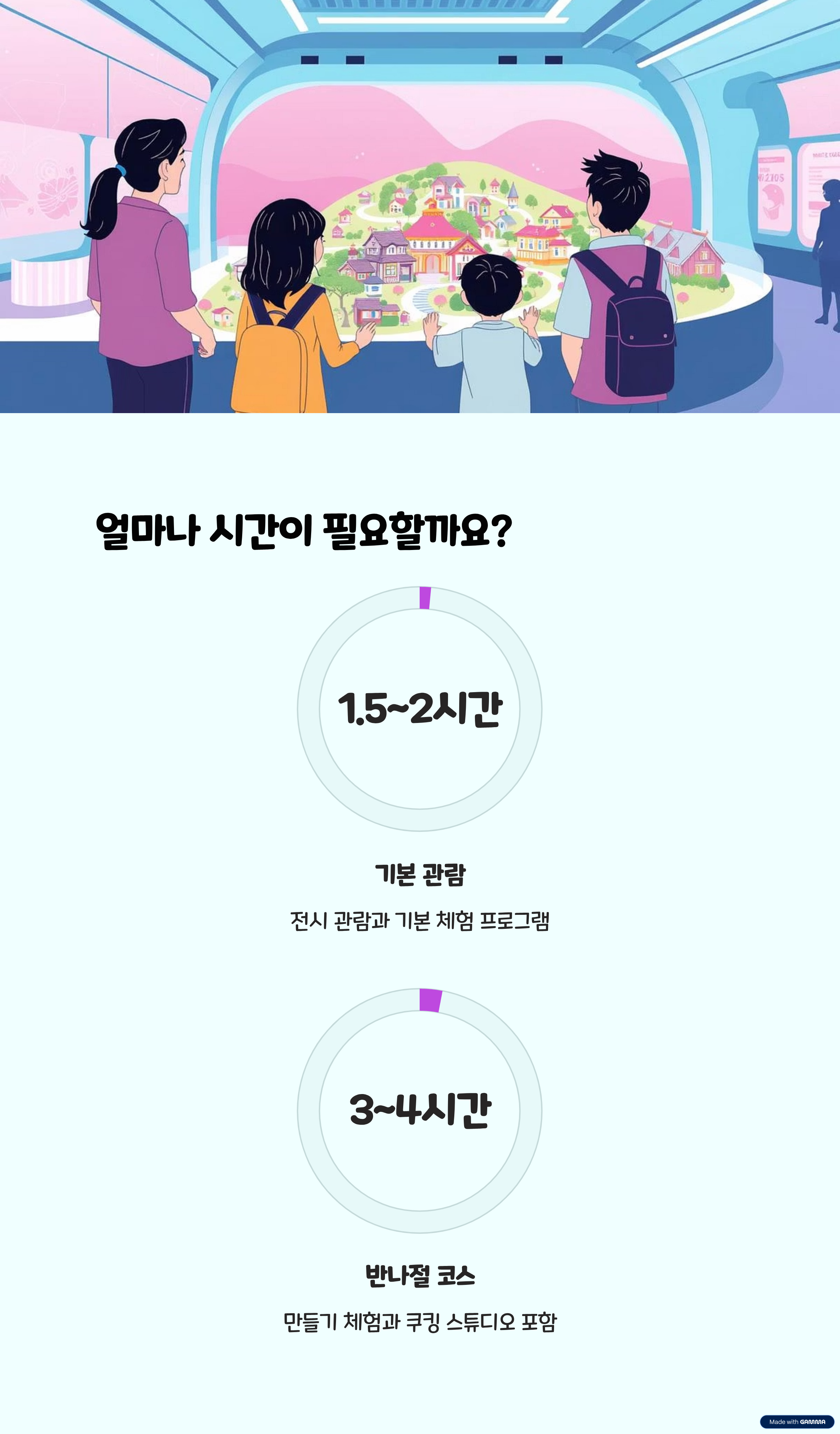 평균적으로 1시간 30분에서 2시간 정도면 전시 관람과 체험 프로그램을 모두 즐길 수 있습니다. 전시장 관람 후 이어지는 만들기 체험이나 쿠킹 스튜디오까지 참여한다면 반나절 코스로 충분히 알차게 보낼 수 있습니다.