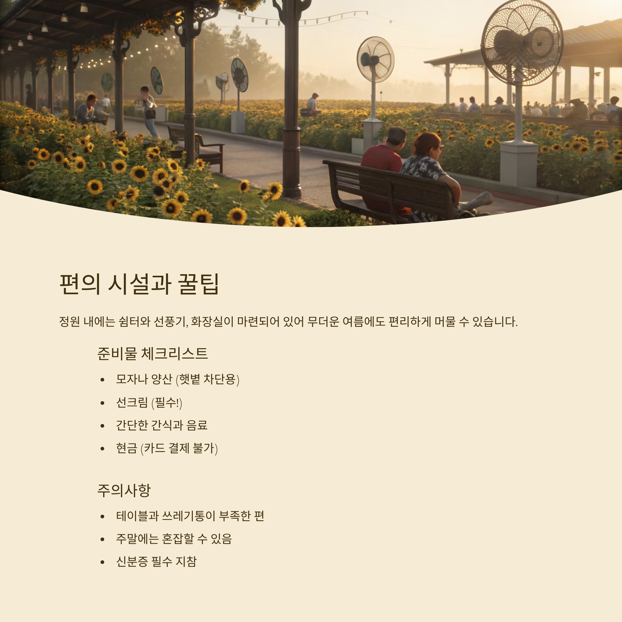 정원 내에는 쉼터와 선풍기, 화장실이 마련되어 있어 무더운 여름에도 편리하게 머물 수 있습니다. 다만 테이블과 쓰레기통이 부족한 편이니 간단한 간식이나 음료를 챙겨가는 것이 좋습니다. 햇볕을 피할 수 있는 모자나 양산, 선크림도 꼭 준비하세요.