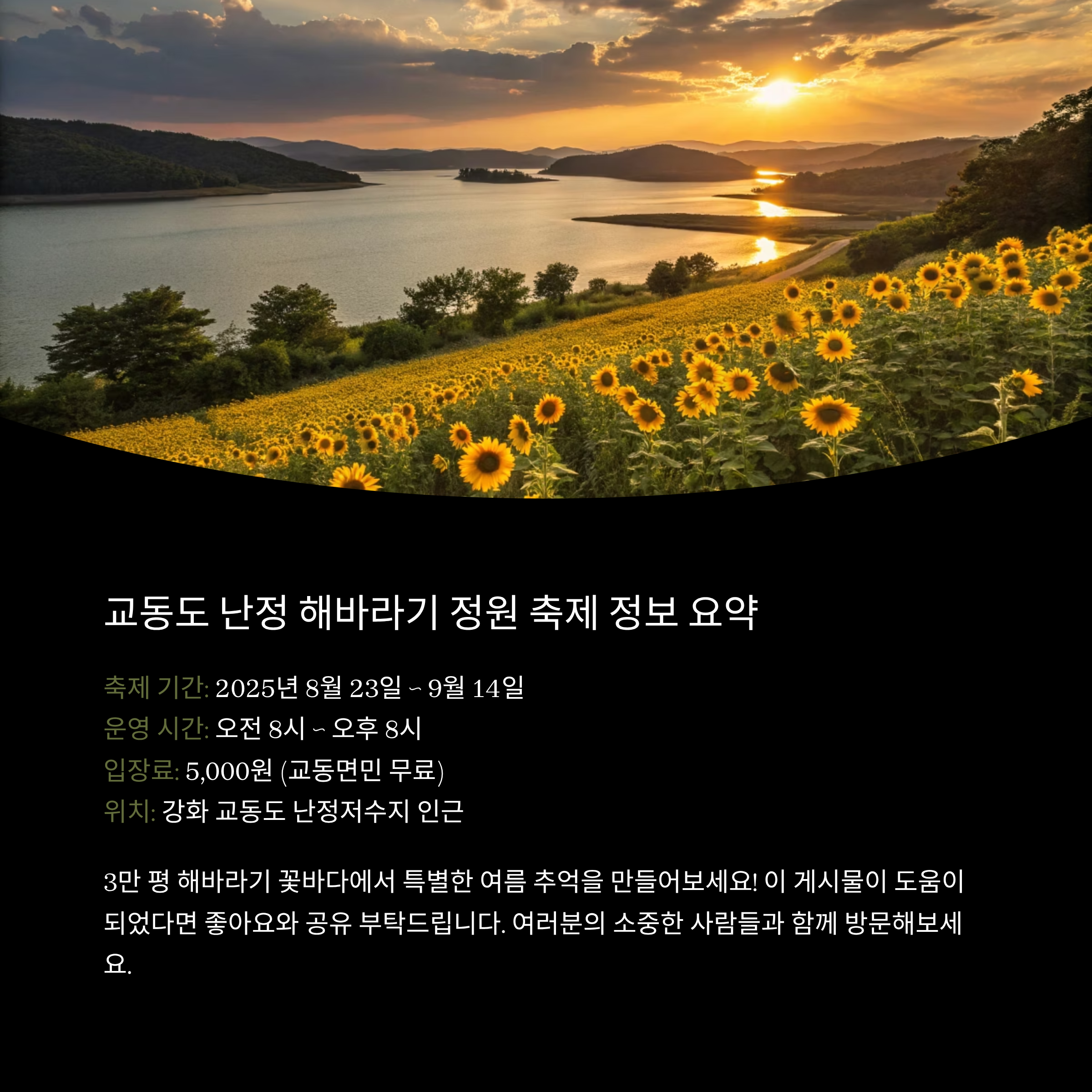 강화 교동도 난정 해바라기 정원은 3만 평 규모의 해바라기 군락지가 펼쳐져 마치 꽃바다에 들어온 듯한 장관을 만날 수 있는 곳입니다. 2024년 8월 23일부터 9월 14일까지 열리는 해바라기 축제는 자연의 아름다움과 지역의 정취를 동시에 느낄 수 있는 특별한 경험을 선사합니다. 이번 글에서는 난정 해바라기 정원의 매력, 축제 정보, 즐길 거리와 교동도의 숨은 명소까지 모두 소개해 드릴게요.