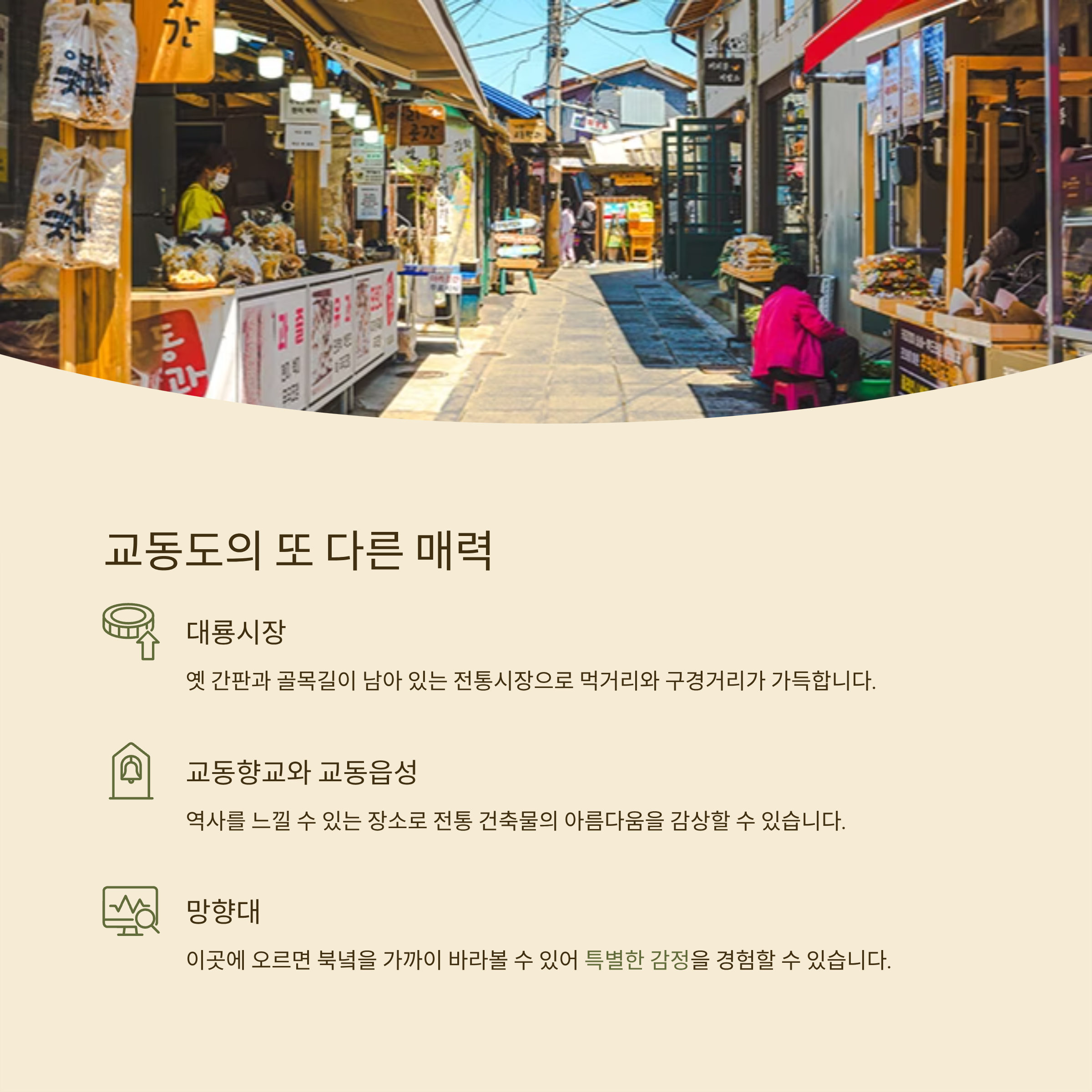 난정 해바라기 정원 외에도 교동도에는 다양한 명소가 있습니다. 대룡시장은 옛 간판과 골목길이 남아 있는 전통시장으로 먹거리와 구경거리가 가득하고, 교동향교와 교동읍성은 역사를 느낄 수 있는 장소입니다. 망향대에 오르면 북녘을 가까이 바라볼 수 있어 특별한 감정을 경험할 수 있습니다.