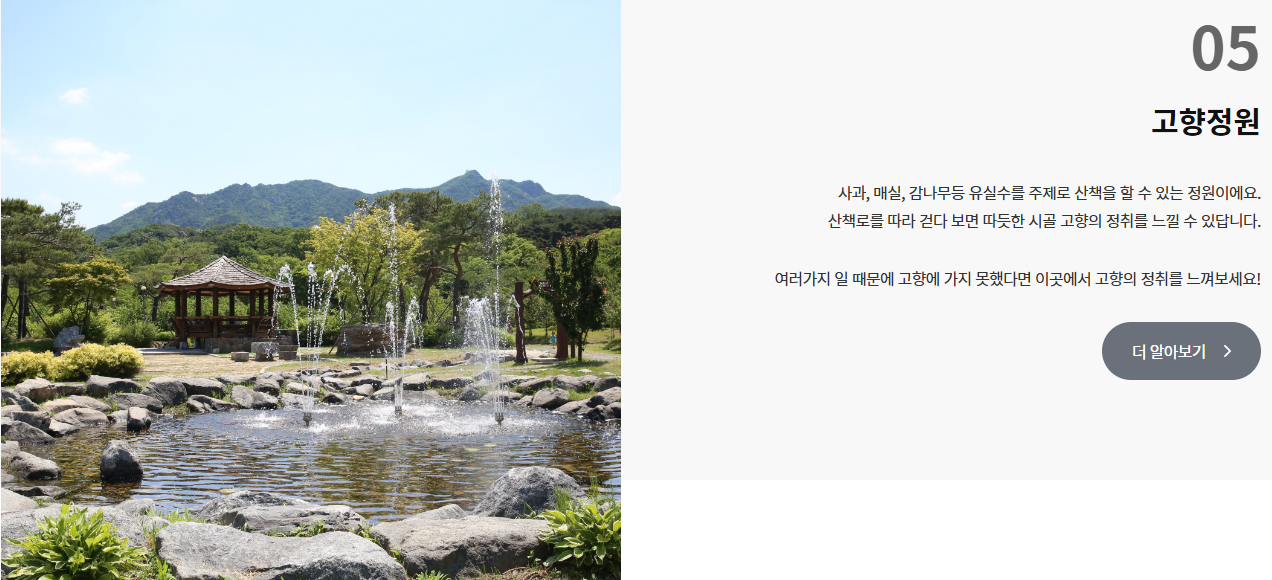 장미 아치 구간, 프랑스풍 분수대, 유럽식 테라스 벤치입니다.