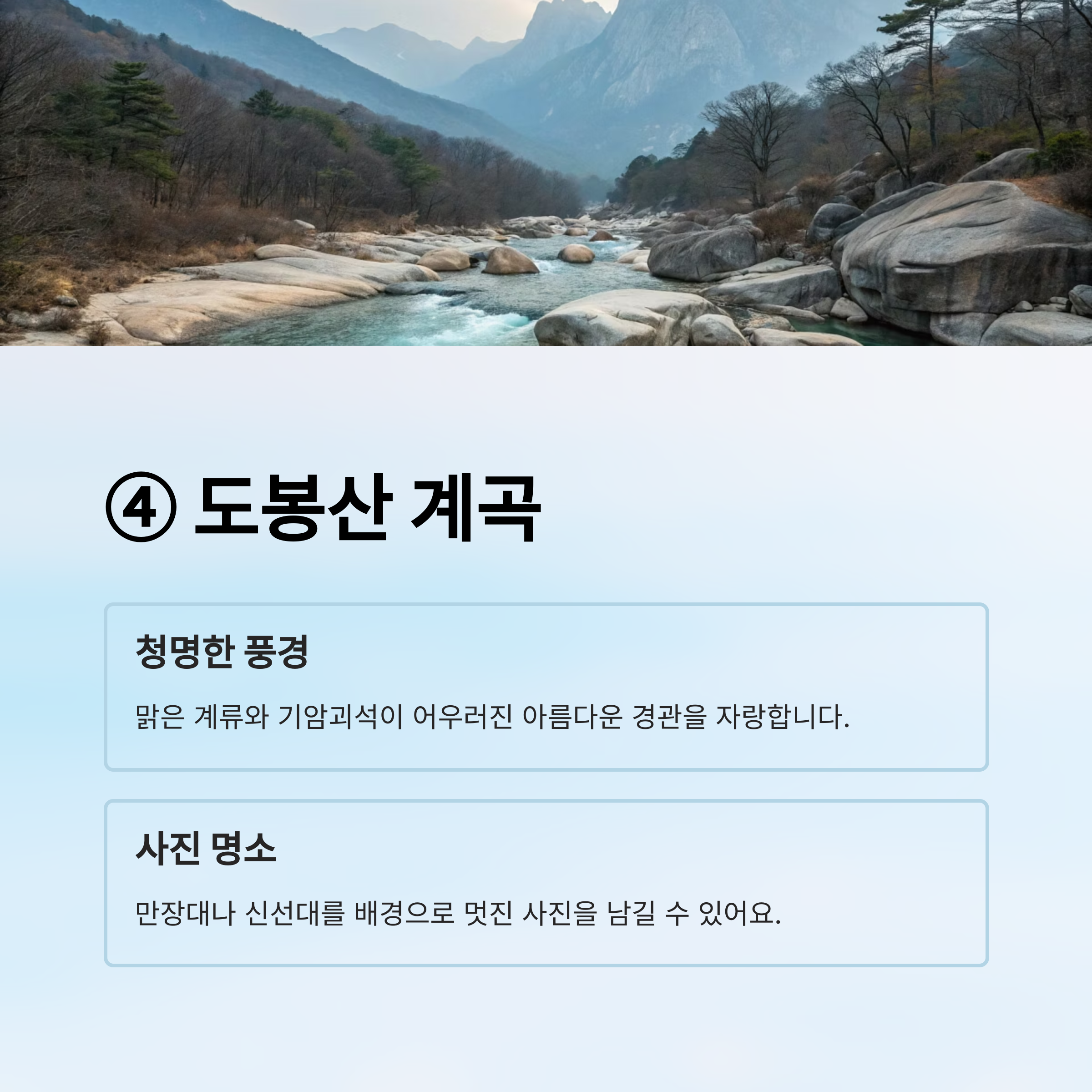 ④ 도봉산 계곡: 청명한 풍경과 시원한 암봉이 매력