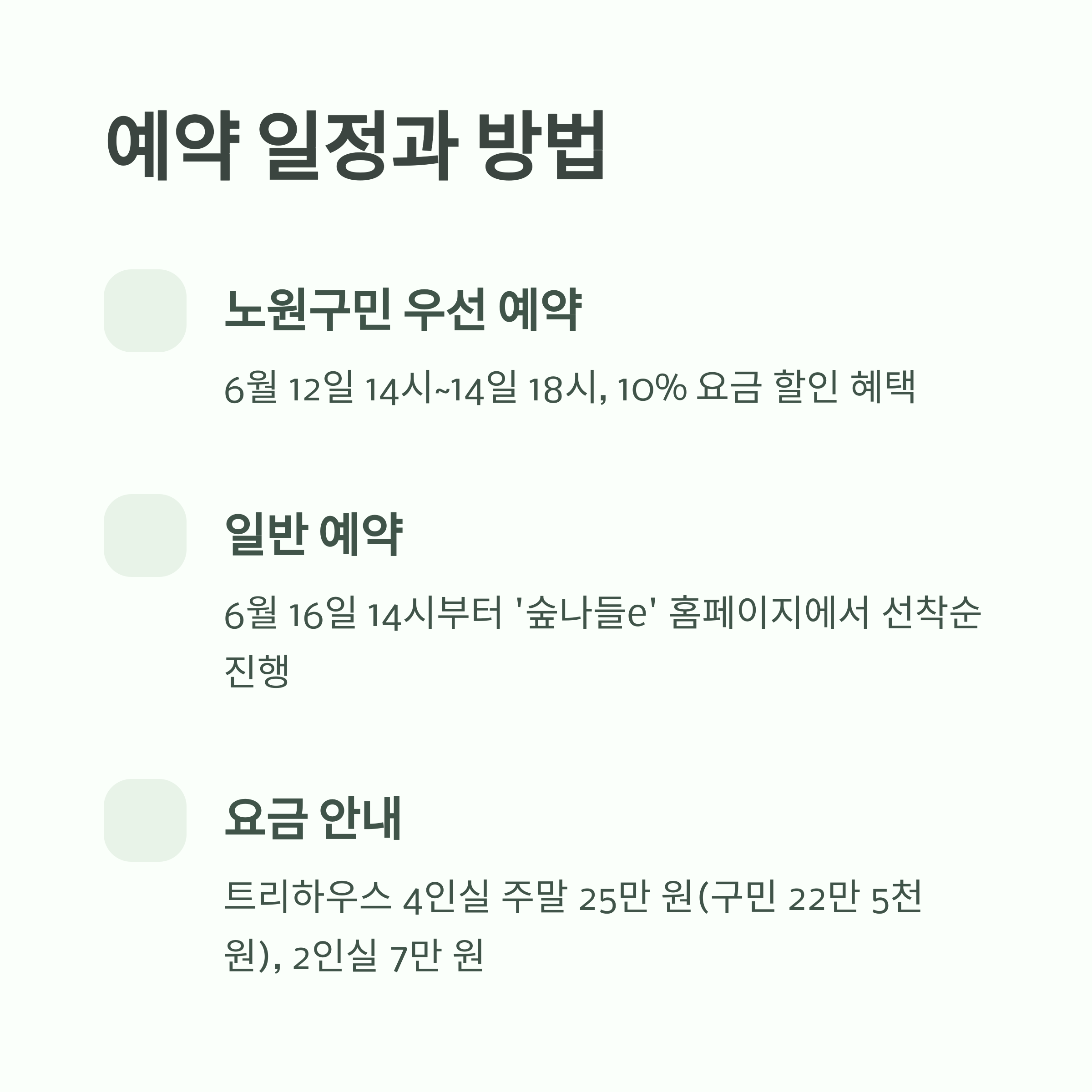 | 일반 예약 | 6월 16일 14시부터 시작 | 산림청 ‘숲나들e’ 선착순 예약 진행 |