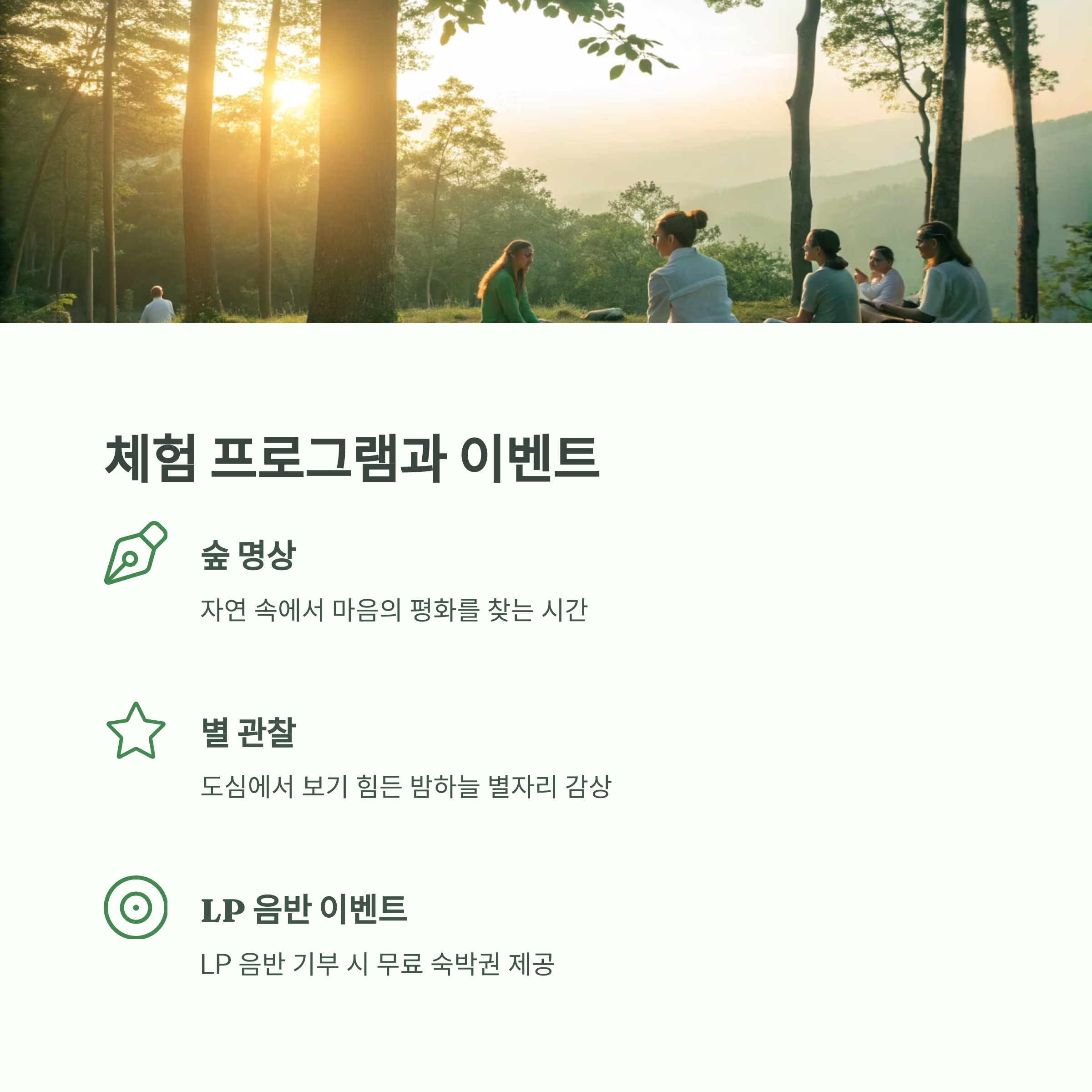 - 계절별 체험: 숲 명상, 전통놀이, 별 관찰 프로그램 등