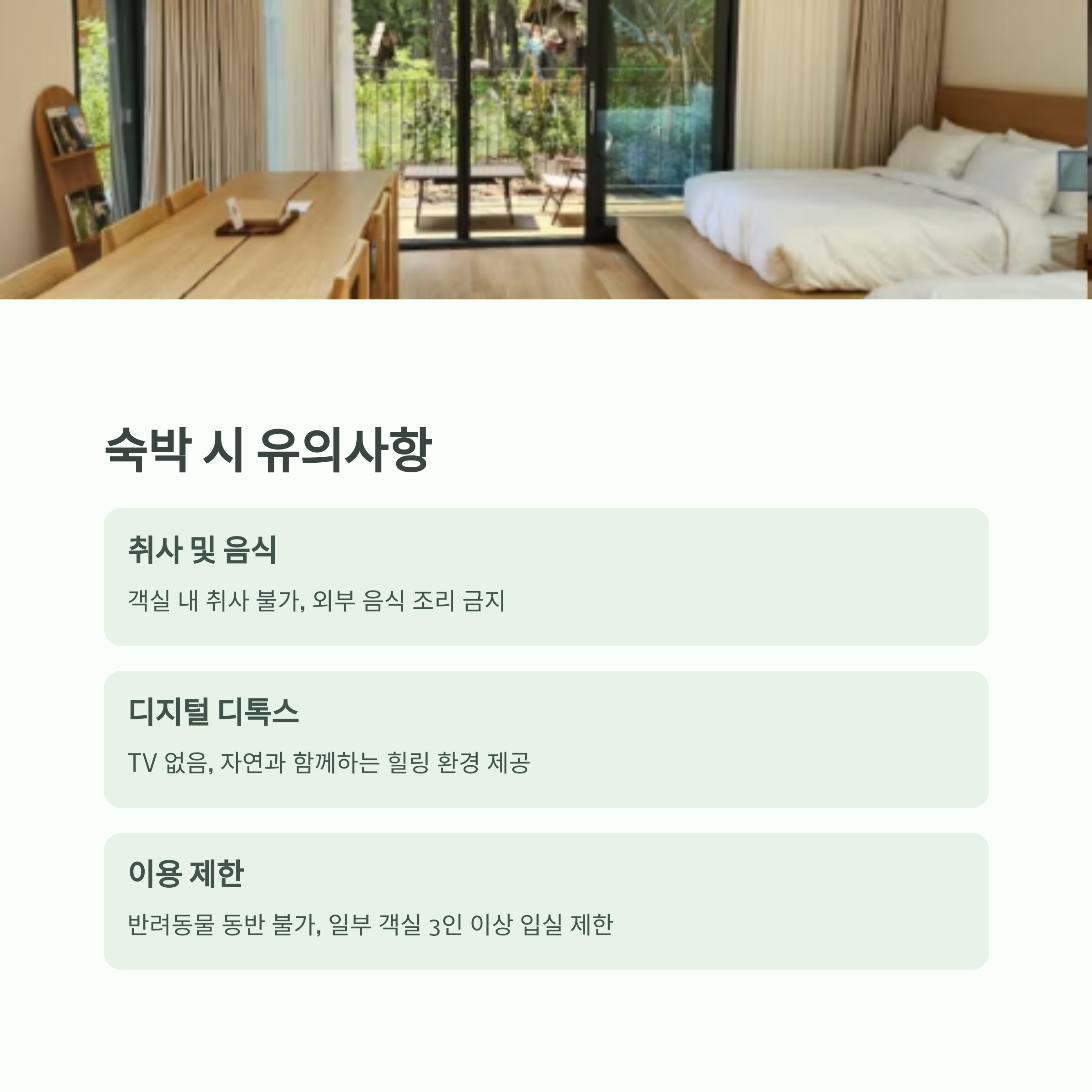 - 객실 내 취사 불가, 외부 음식 조리 금지