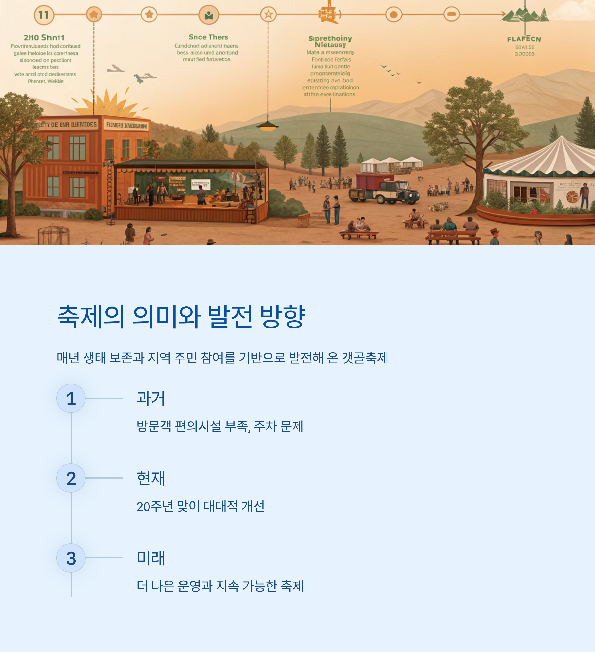 갯골축제는 매년 생태 보존과 지역 주민 참여를 기반으로 발전해 왔습니다. 방문객 편의시설 부족과 주차 문제 같은 과제도 있었지만, 2025년 20주년 축제는 이를 개선하고 더 나은 운영을 선보일 예정입니다.