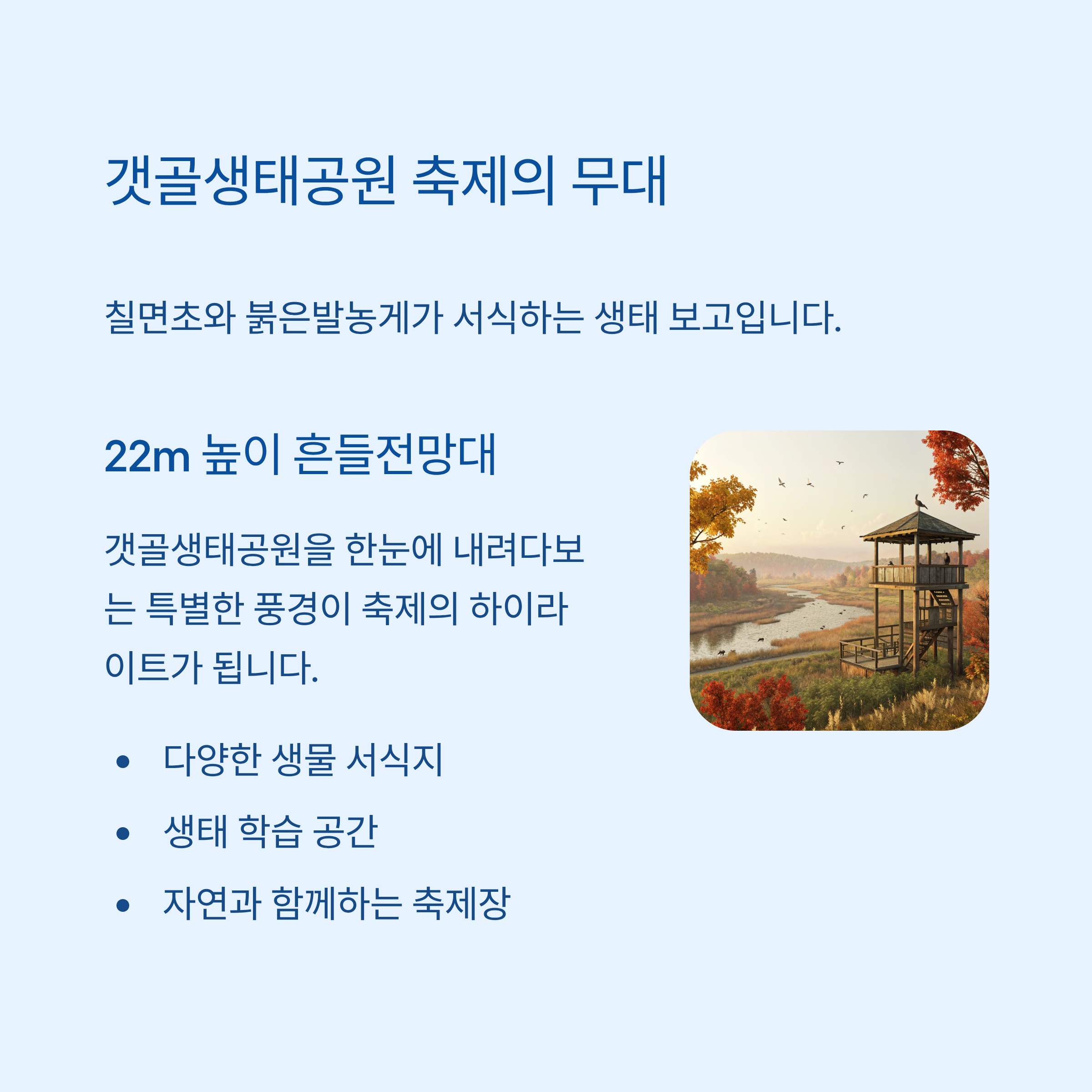 갯골생태공원은 칠면초와 붉은발농게 같은 다양한 생물이 서식하는 생태 보고입니다. 특히 22m 높이의 흔들전망대에서 내려다보는 풍경은 축제의 또 다른 하이라이트가 될 것입니다.