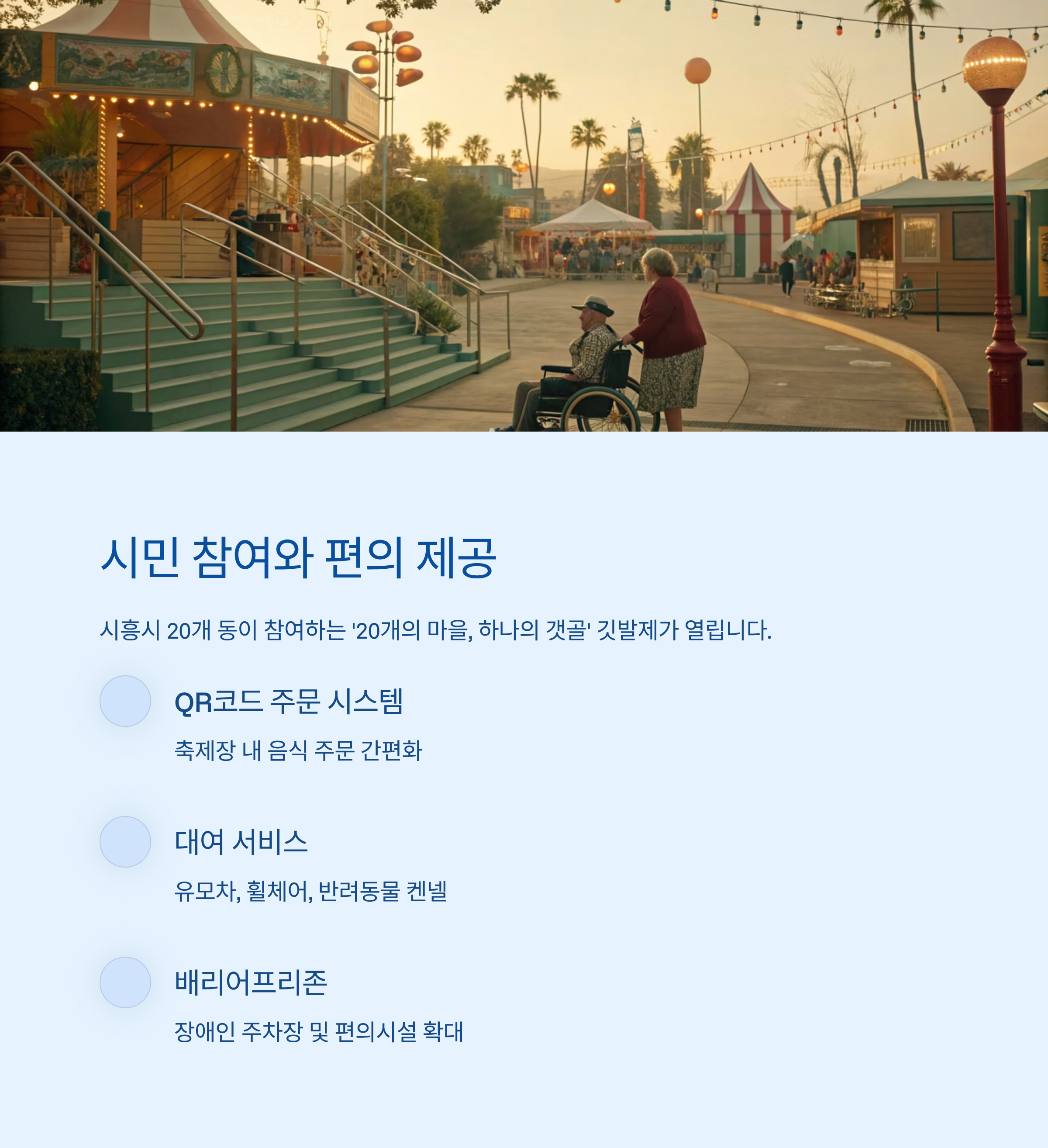 시흥시 20개 동이 참여하는 깃발제 ‘20개의 마을, 하나의 갯골’이 열리며, 시민이 주인공이 되는 축제로 운영됩니다. 또한 QR코드 주문 시스템이 도입되어 축제장 내 음식 주문이 간편해지고, 유모차·휠체어·반려동물 켄넬 대여 서비스도 마련됩니다. 장애인 주차장과 배리어프리존도 확대됩니다.