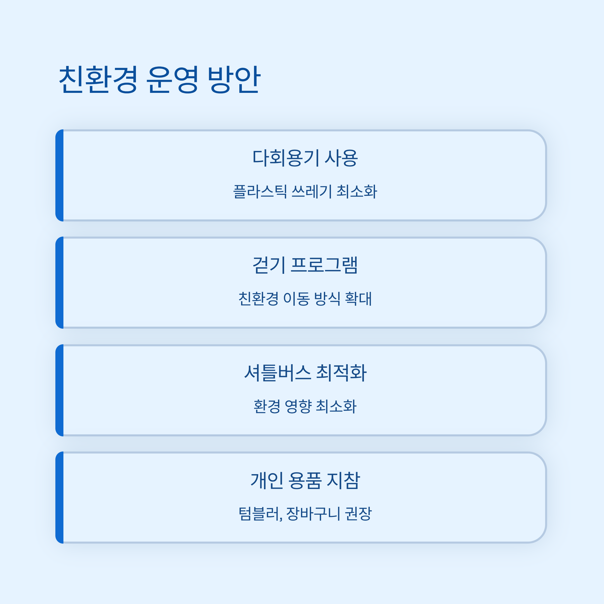 플라스틱 쓰레기를 최소화하기 위해 다회용기 사용과 개인 텀블러·장바구니 지참이 권장됩니다. 또한 걷기 프로그램을 확대하고, 셔틀버스 운행 대수를 최적화하여 환경 영향을 줄이는 데 집중하고 있습니다.