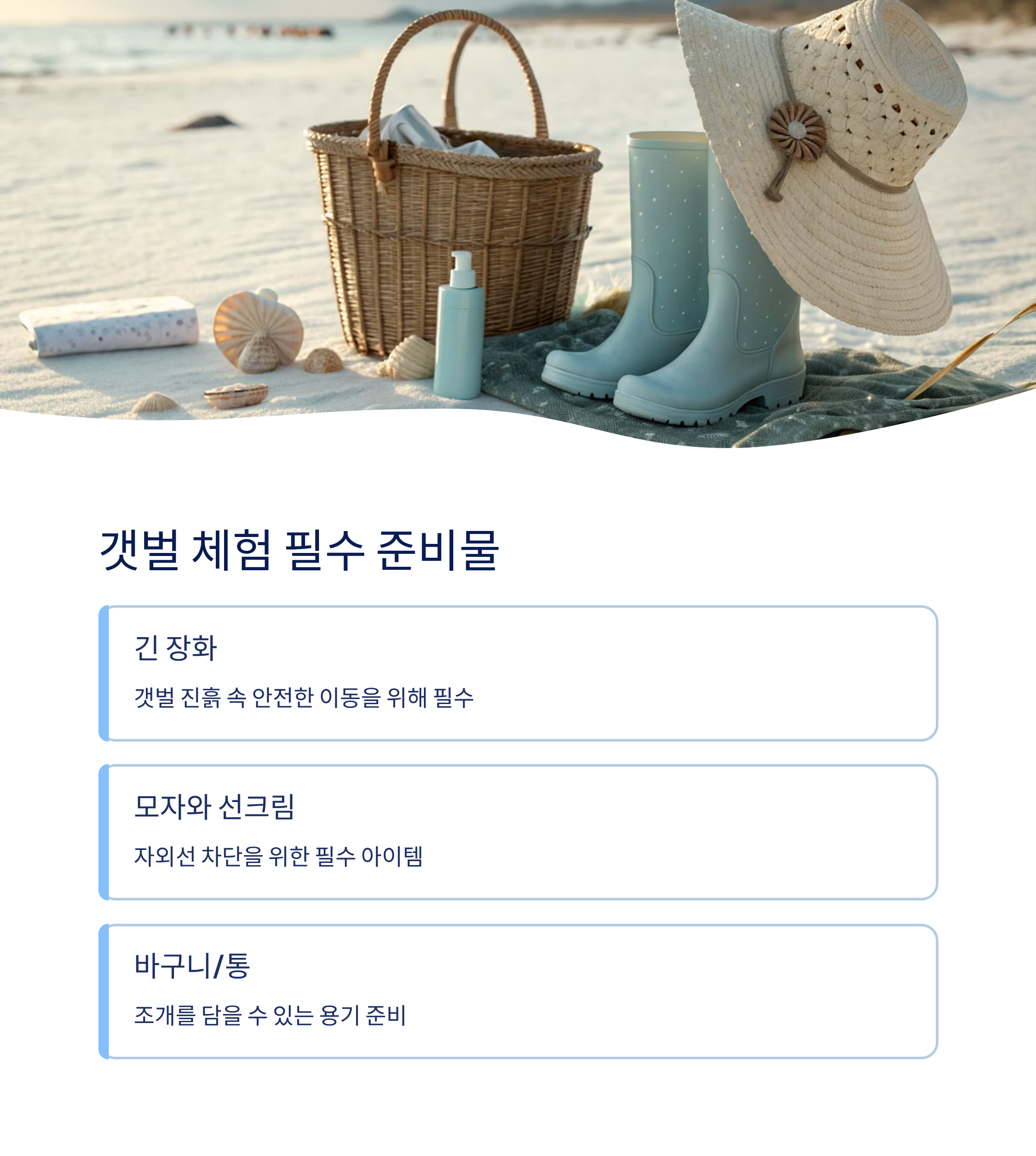 갯벌은 진흙과 바닷물이 함께하는 곳이라 준비물이 꼭 필요합니다. 긴 장화나 물놀이용 신발, 모자와 선크림은 필수이며, 조개를 담을 바구니나 통도 챙겨야 합니다. 물티슈와 세면도구, 간식과 음료까지 준비하면 더욱 편리합니다.