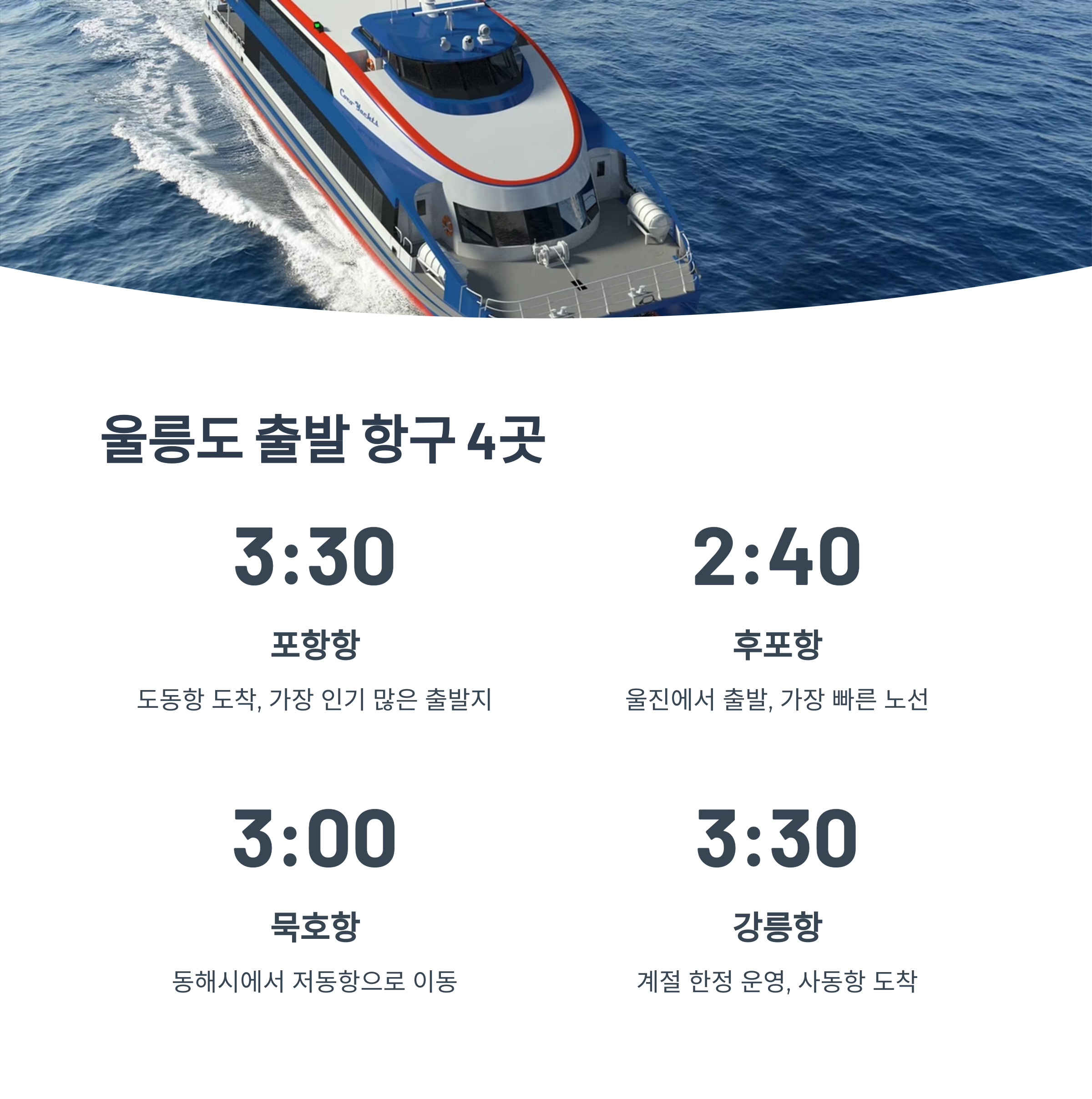 | 강릉항 | 울릉도 사동항 | 약 3시간 30분 (계절 한정 운영) |