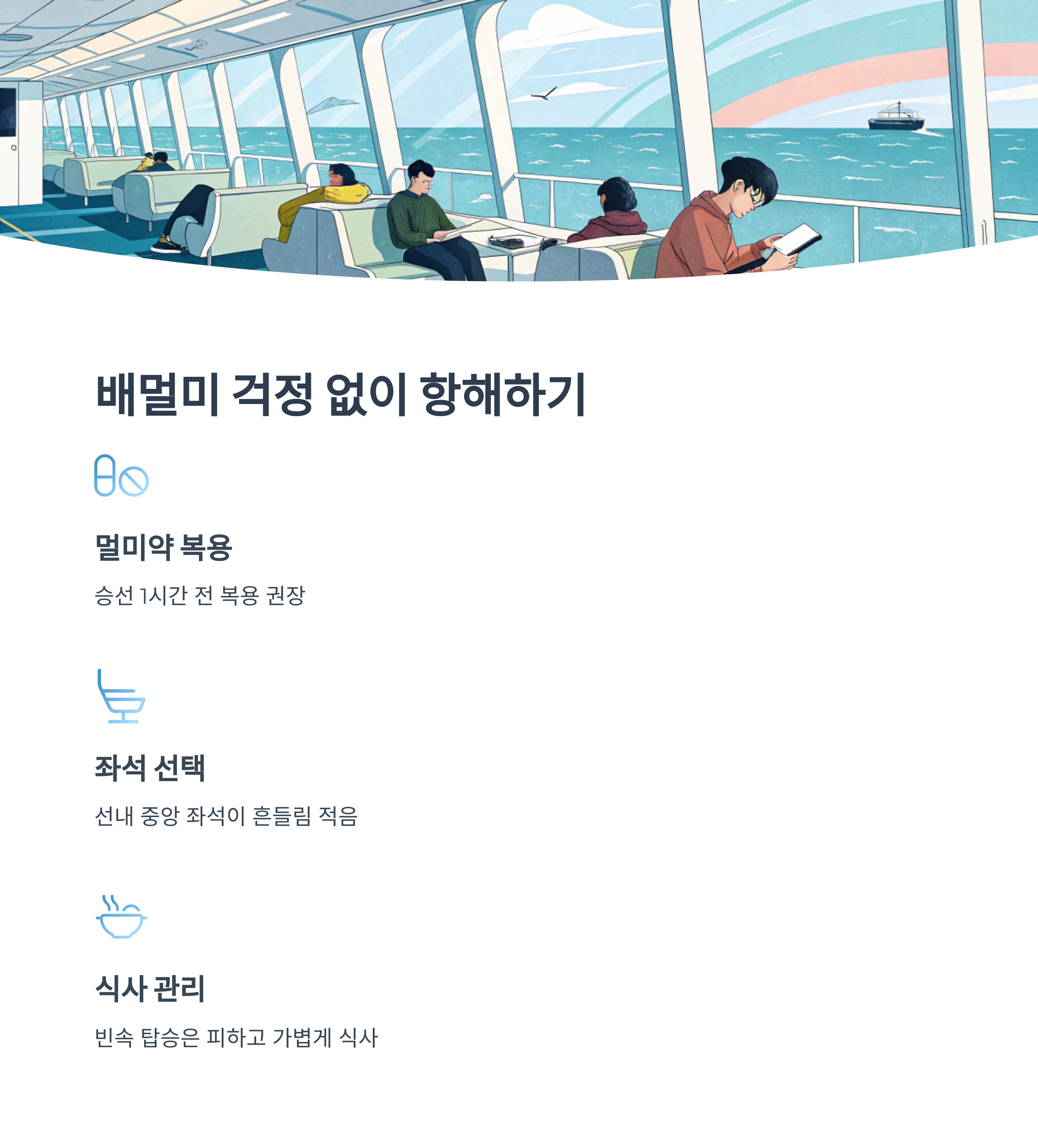 - 아침 첫 배보다 오후 배가 파도가 잔잔한 경우 많음