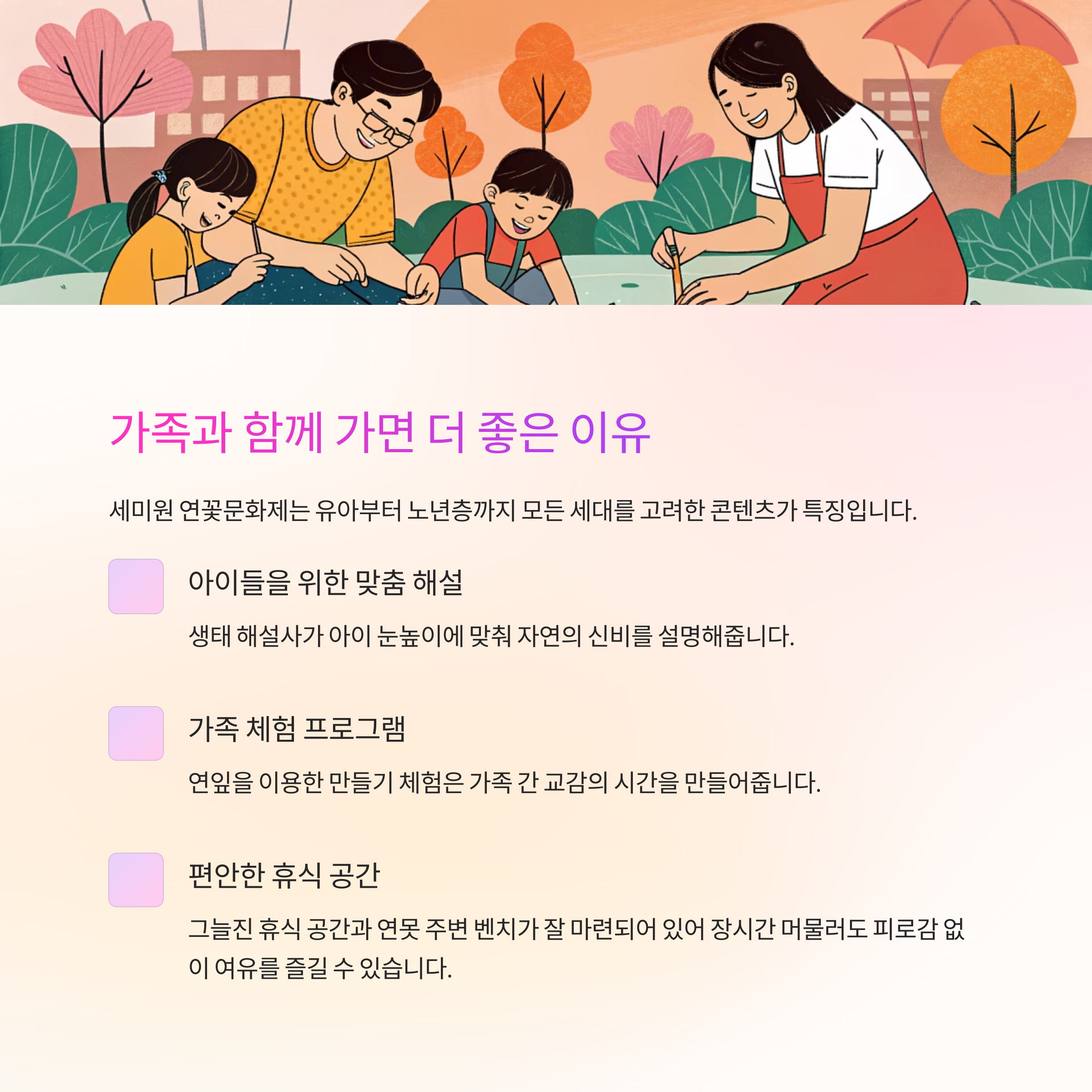 세미원 연꽃문화제는 유아부터 노년층까지 모든 세대를 고려한