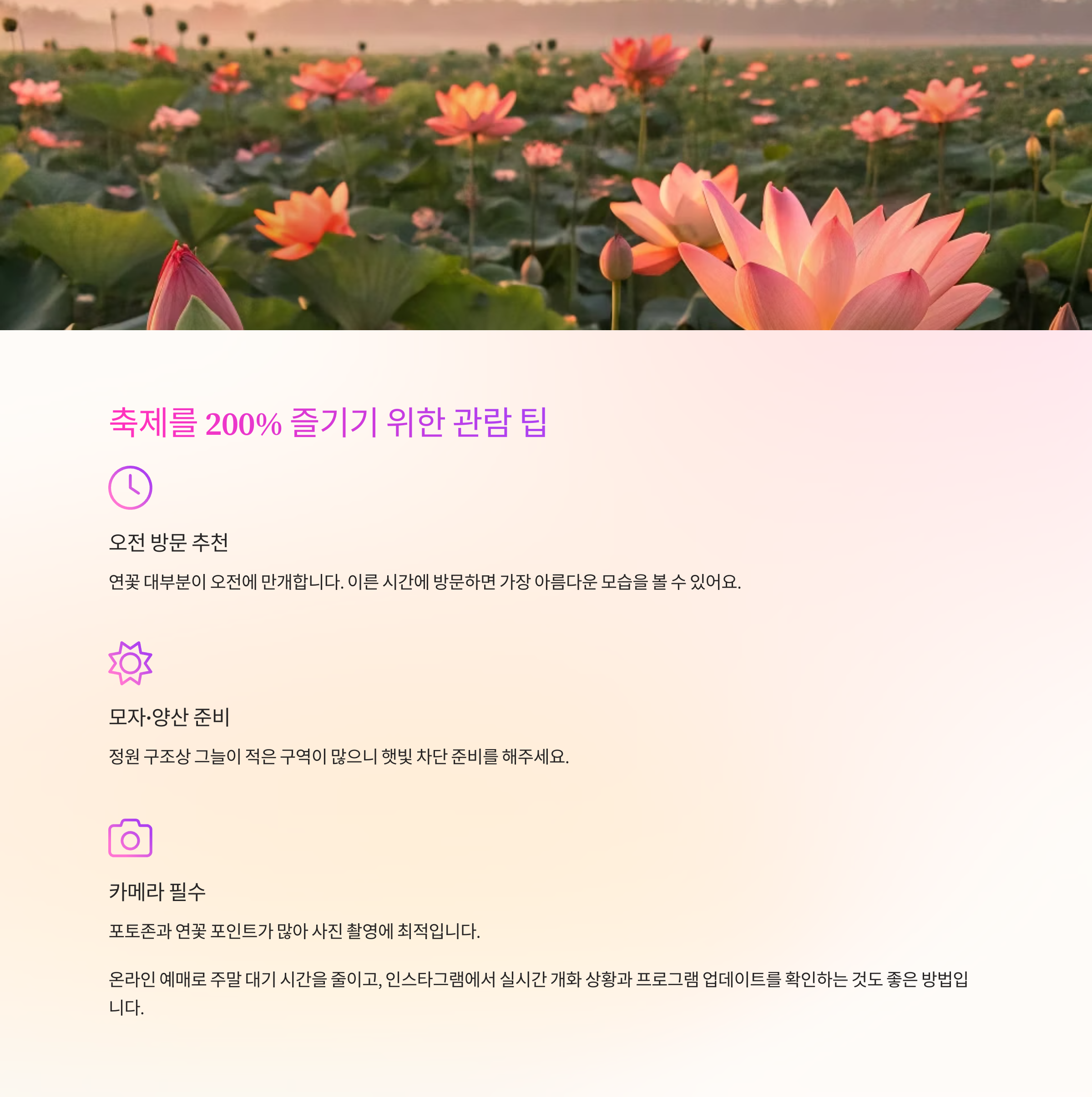 - 카메라 필수: 포토존과 연꽃 포인트가 많아 사진 촬영에 최적입니다.