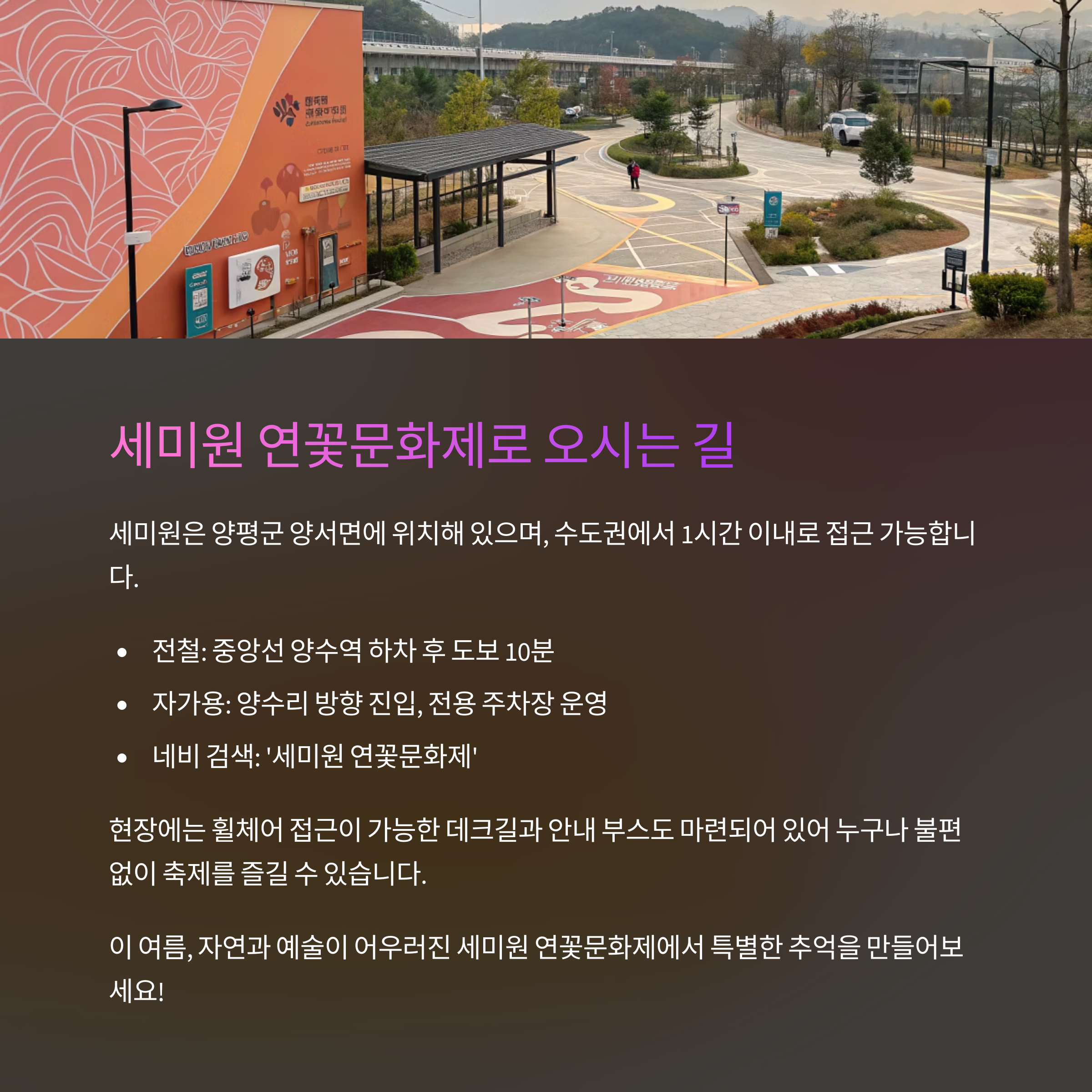 - 자가용: 양수리 방향 진입, 전용 주차장 운영
