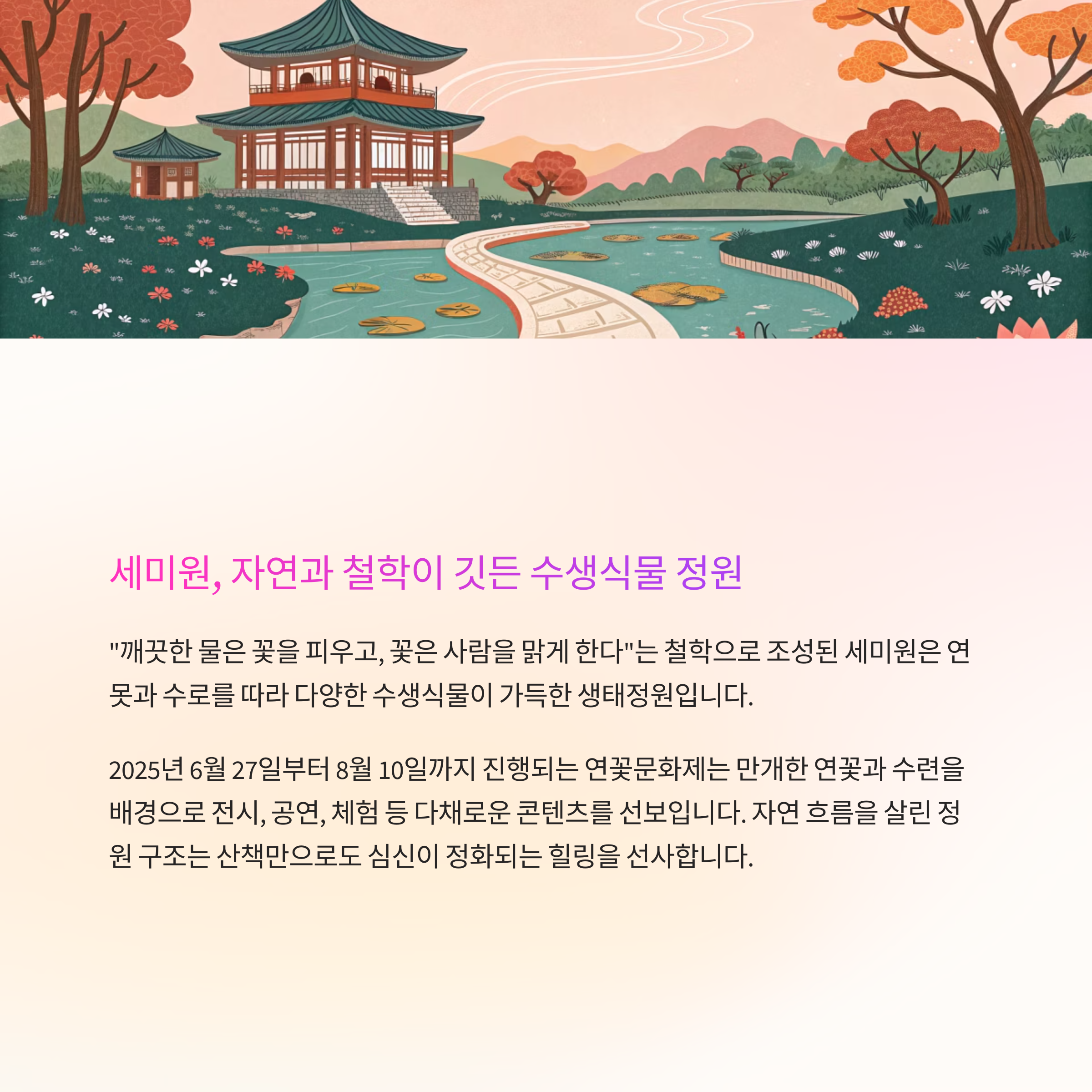 전시, 공연, 체험 등 다채로운 콘텐츠를 선보입니다. 자연과 전통, 그리고 예술이 공존하는 세미원 연꽃문화제의