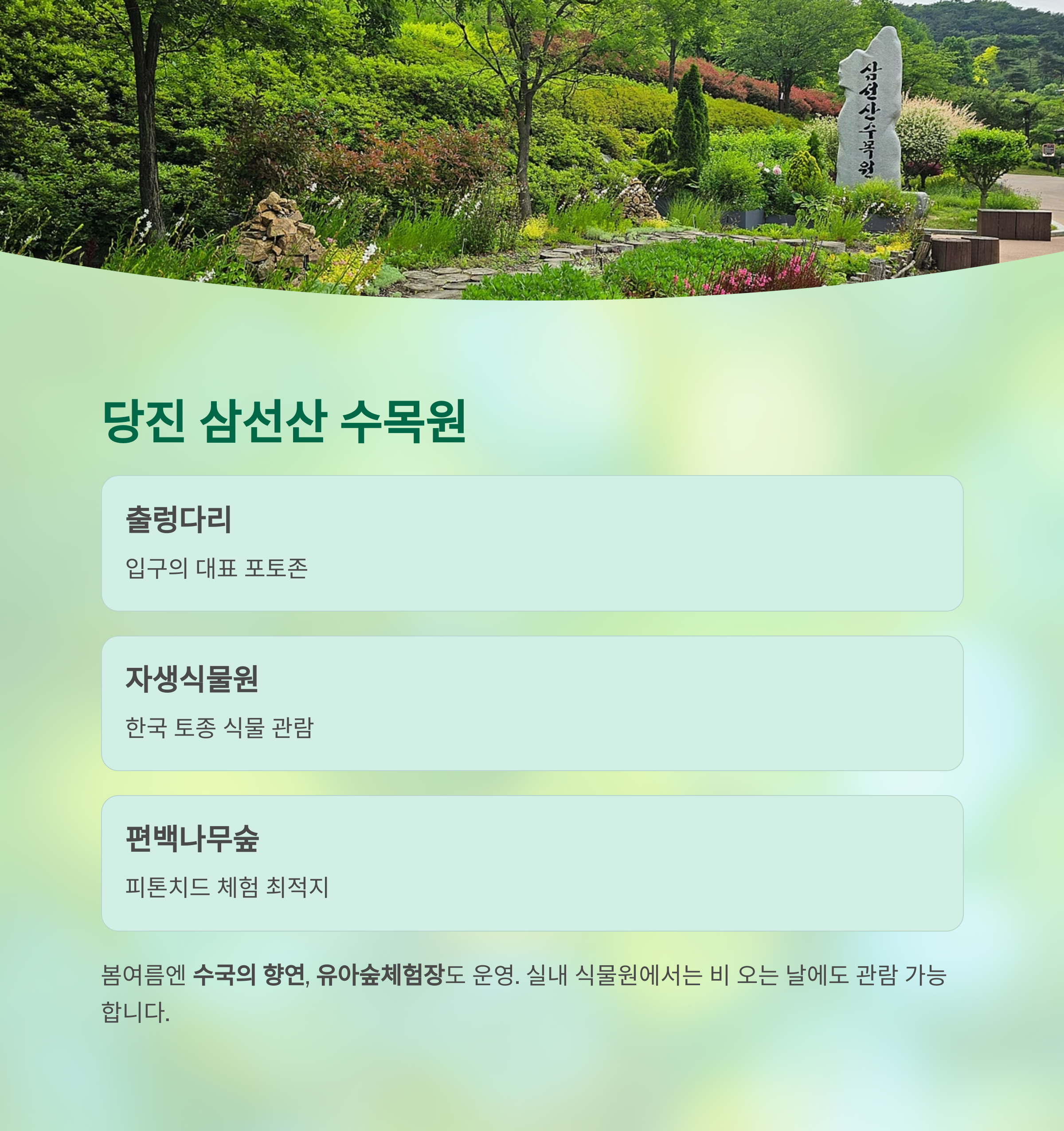 | 삼선산 수목원 | 암석원 산책, 출렁다리 체험 | 가족 단위 인기 |