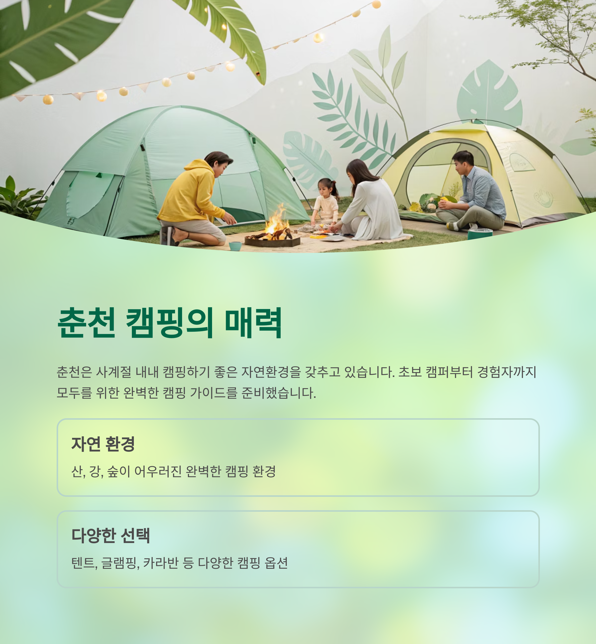 춘천은 가족 단위 캠핑객에게 최적화된 환경을 갖추고 있습니다.
