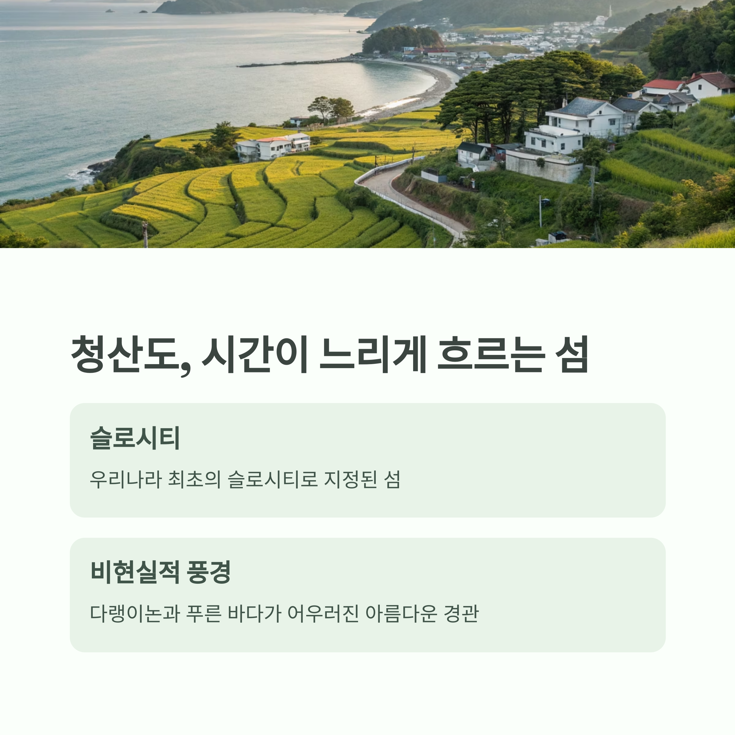 전라남도 완도군에 위치한 청산도는 우리나라 최초의 슬로시티로 지정된 섬입니다. 자동차보다 걷는 속도가 어울리는 섬, 다랭이논과 푸른 바다가 어우러진 비현실적인 풍경이 펼쳐집니다. 걷기 여행, 사진 여행, 힐링 여행 어디든 어울리는 곳으로, 섬마을 특유의 여유를 제대로 느낄 수 있어요.