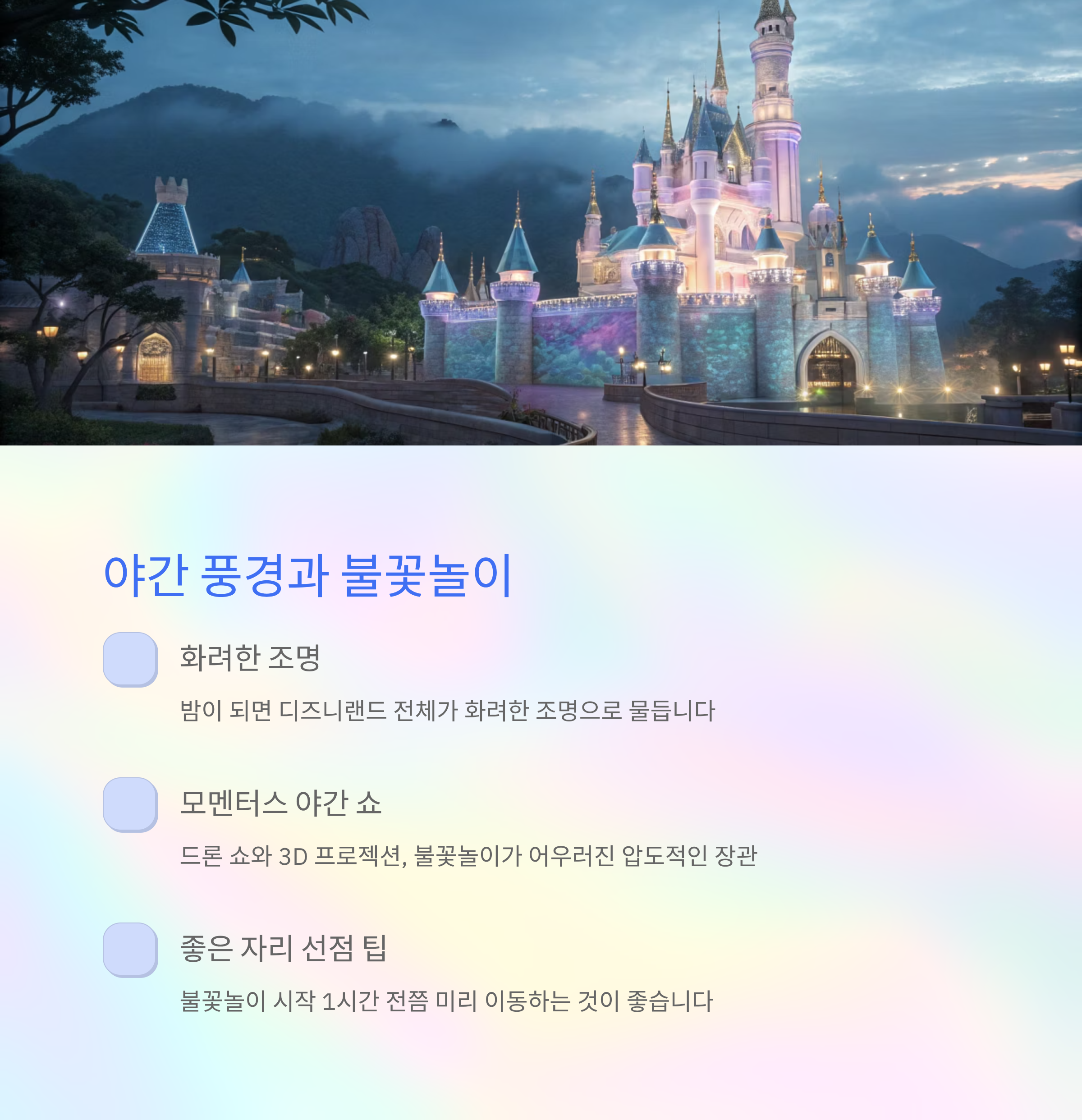 밤이 되면 디즈니랜드 전체가 화려한 조명으로 물듭니다. 특히 20주년 기념 야간 쇼 ‘모멘터스’는 드론 쇼와 3D 프로젝션, 불꽃놀이가 어우러져 압도적인 장관을 연출합니다.
