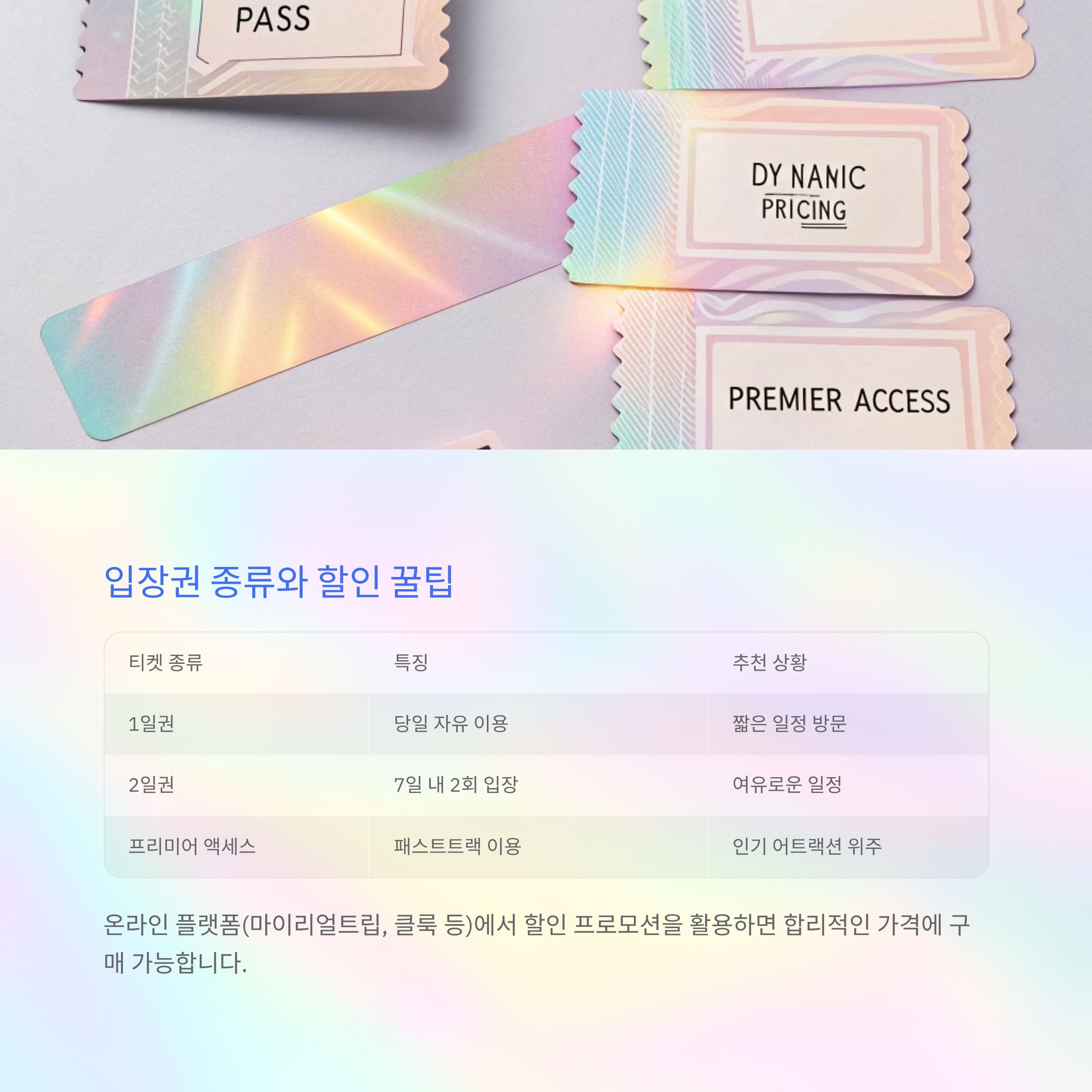 온라인 플랫폼(마이리얼트립, 클룩 등)에서 할인 프로모션을 활용하면 합리적인 가격에 티켓을 구매할 수 있습니다.
