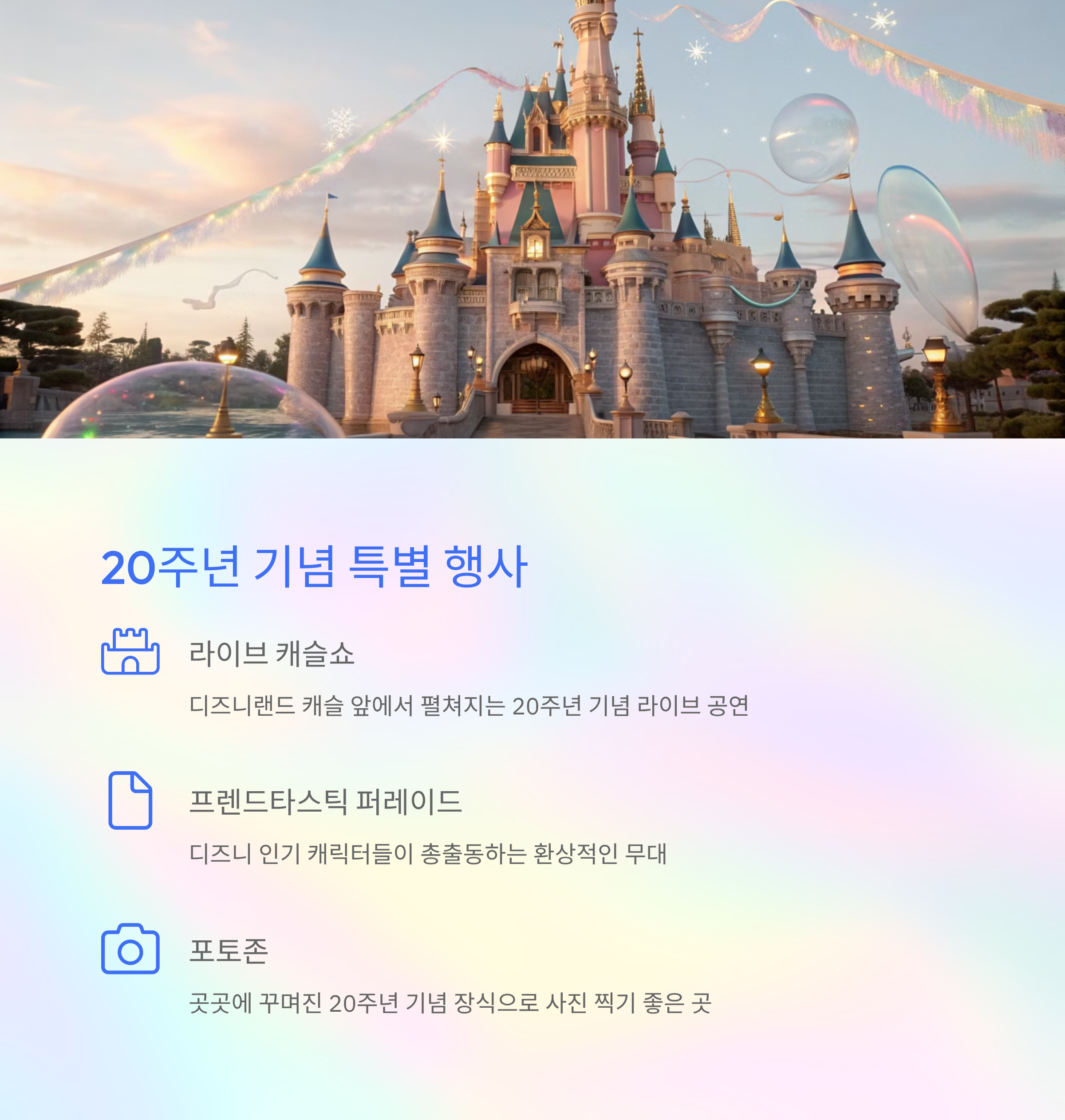 홍콩 디즈니랜드 20주년 축제는 지금이 아니면 경험할 수 없는 특별한 행사입니다. 입장권 할인, 밀쿠폰 활용, 공연 시간 체크까지 꿀팁을 잘 챙기신다면 더욱 알차고 즐거운 시간을 보낼 수 있을 거예요. 가족, 연인, 친구 누구와 함께하든 잊지 못할 추억을 만들어 보세요.
