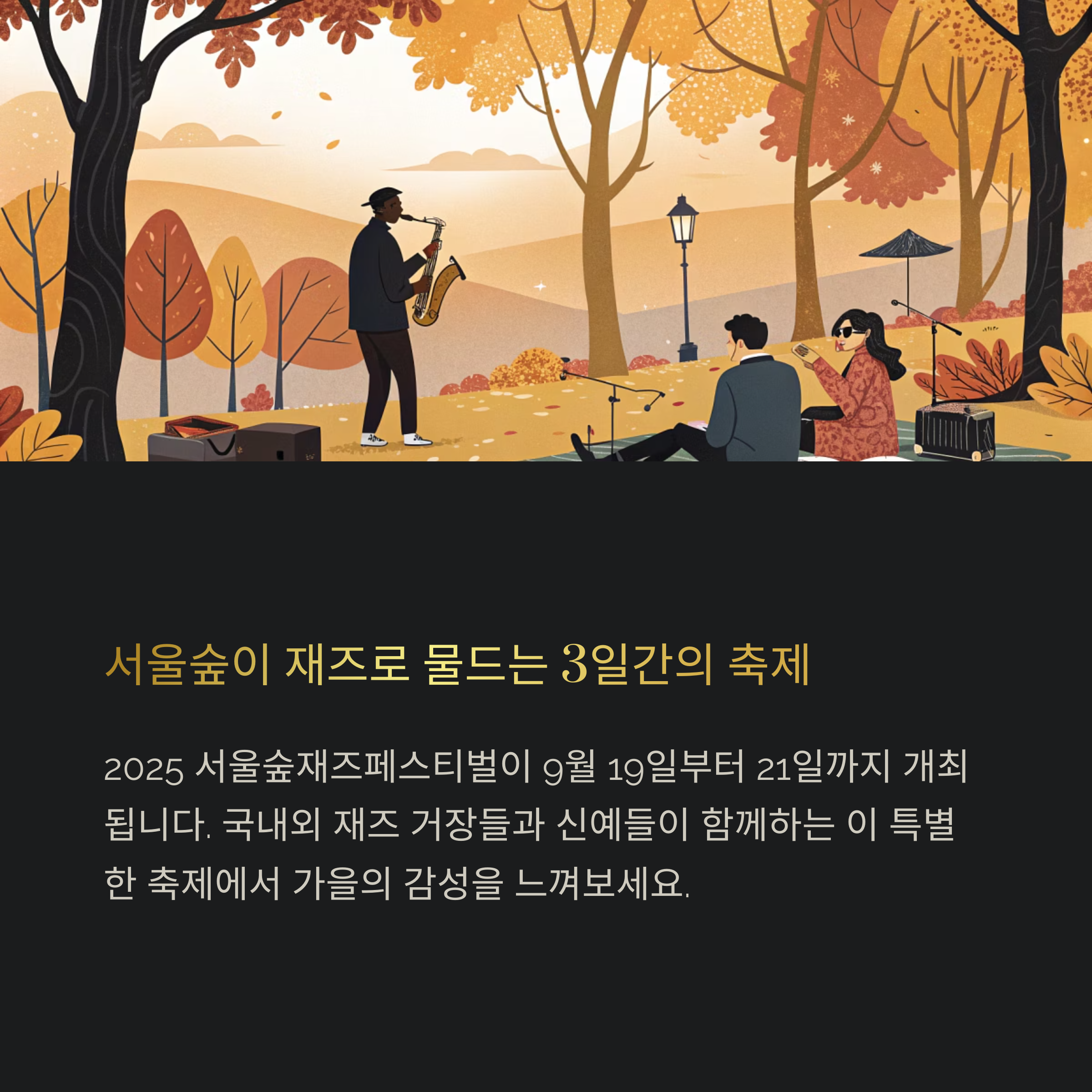 2025 서울숲재즈페스티벌이 드디어 9월 19일부터 21일까지 3일간 개최됩니다. 아름다운 가을, 서울숲의 자연과 감각적인 재즈 선율이 어우러지는 이 특별한 축제는 국내외 재즈 거장들과 떠오르는 신예들까지 화려한 라인업을 자랑하며, 음악 팬들의 기대를 한몸에 받고 있습니다. 본 글에서는 라인업부터 예매 정보, 공연장 이용 팁, 교통 안내까지 모든 정보를 꼼꼼히 안내해 드립니다.