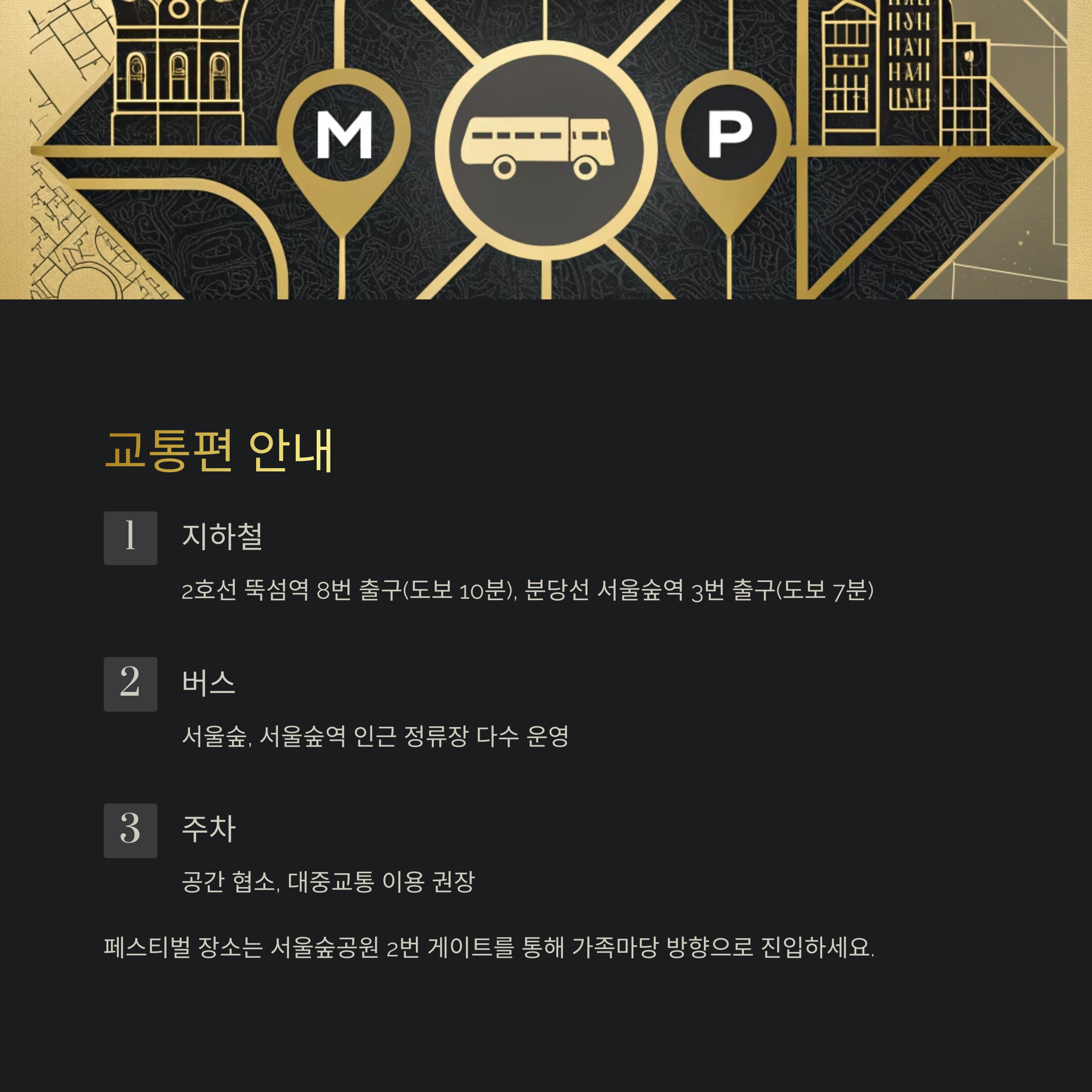 | 버스 | 서울숲, 서울숲역 인근 정류장 다수 운영 |