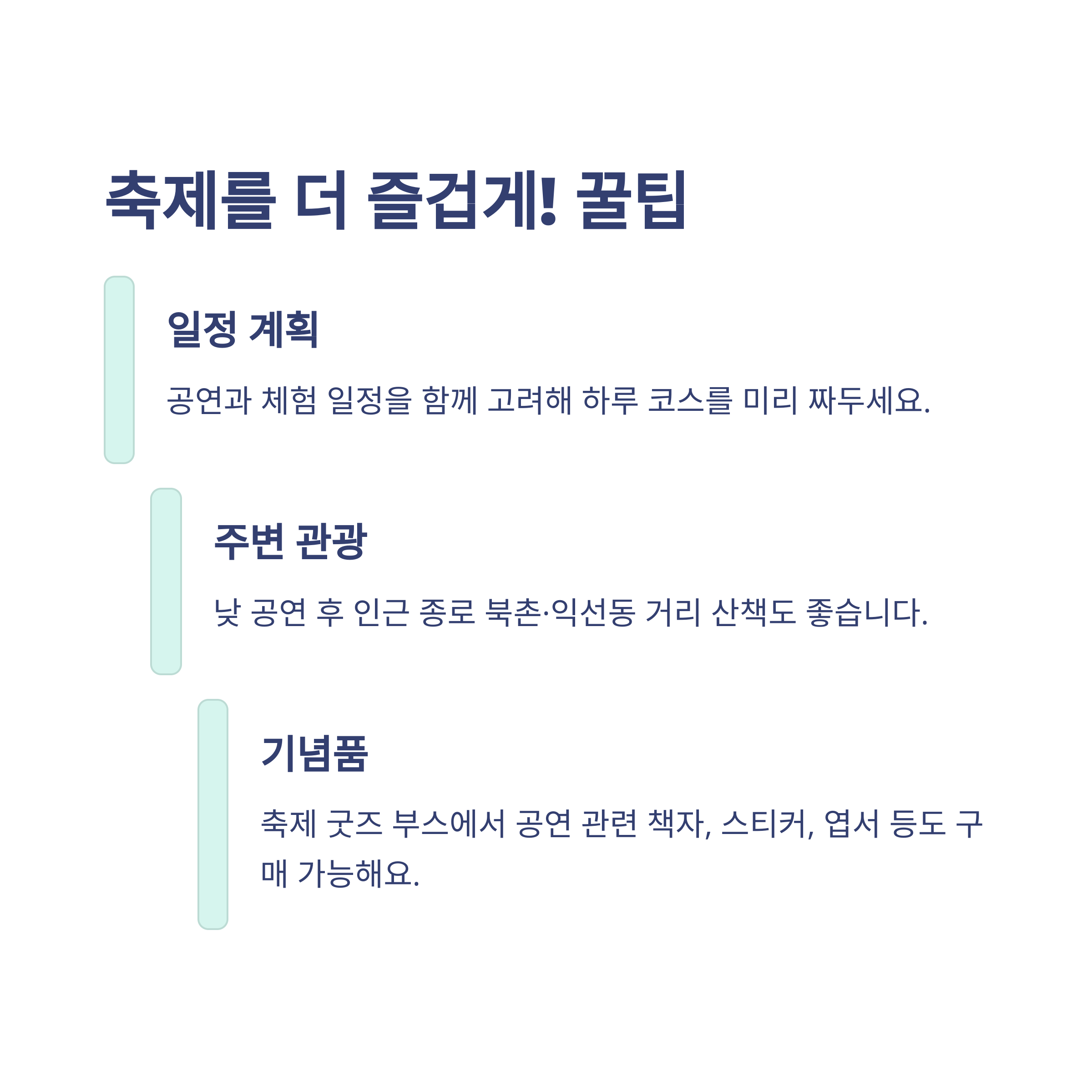 - 공연과 체험 일정을 함께 고려해 하루 코스를 미리 짜두세요.