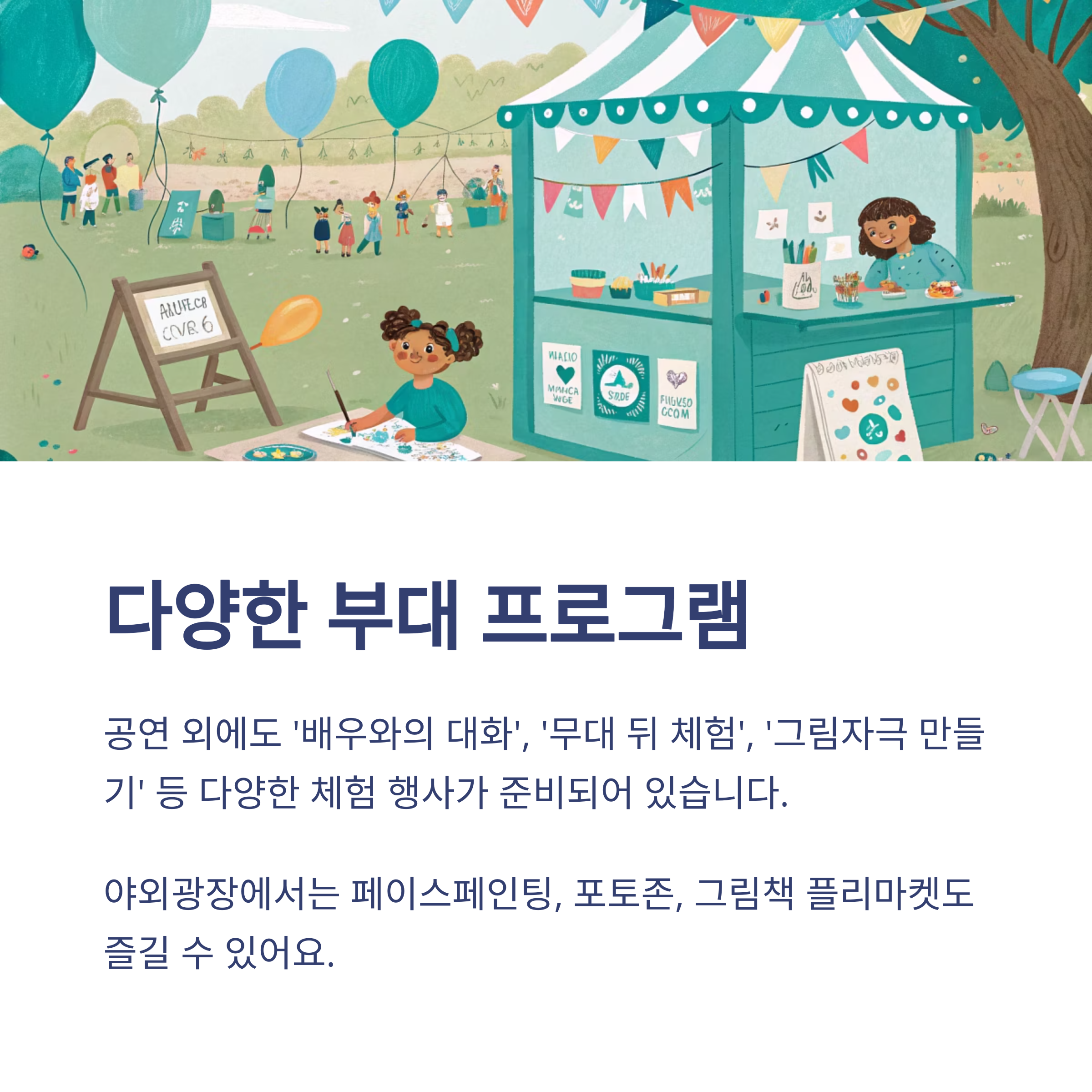 공연뿐 아니라 체험 행사, 아티스트와의 만남, 연극놀이 워크숍 등도 함께 열립니다.