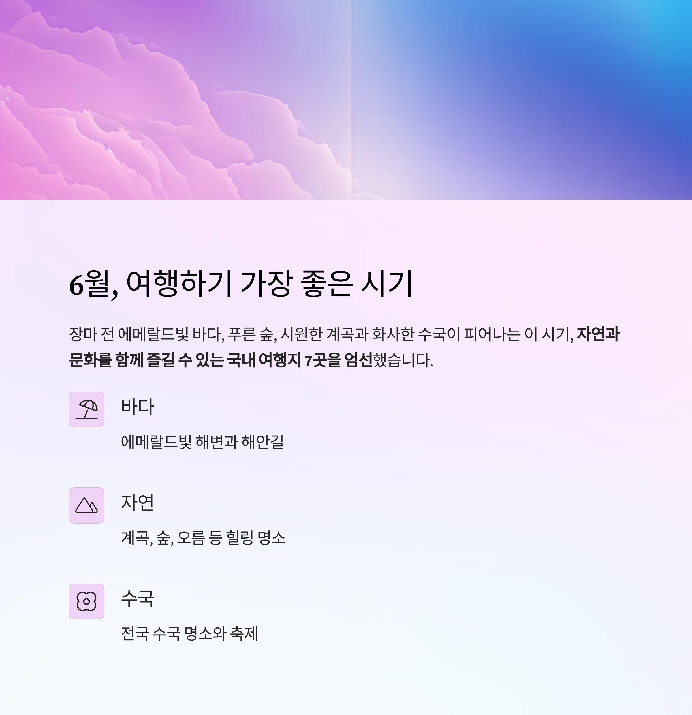 여름이 시작되는 6월, 바다와 숲, 계곡이 어우러진 국내 곳곳은 여행객들에게 최고의 계절을 선사합니다.