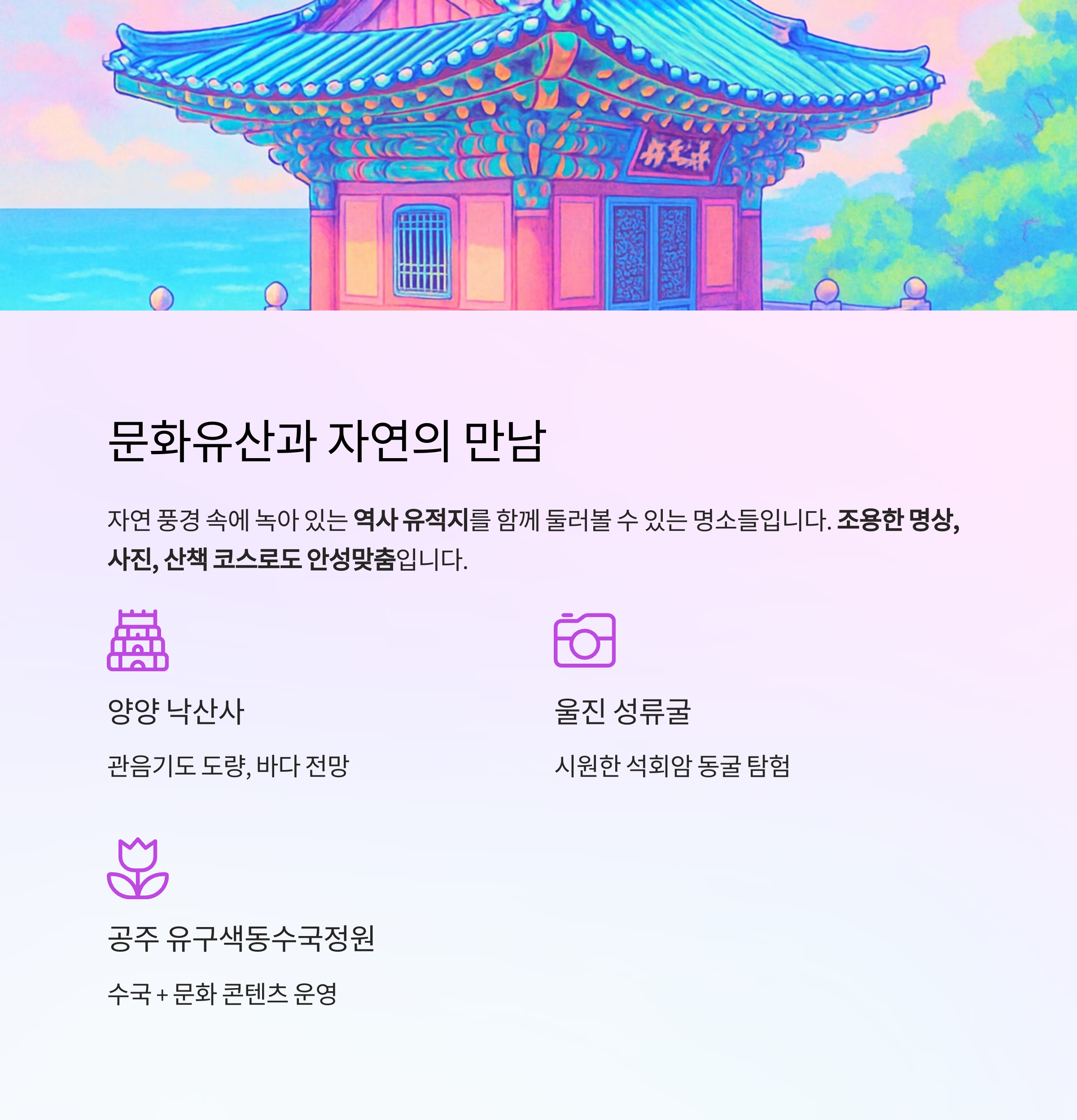 | 강원 양양 | 낙산사 | 관음기도 도량, 바다 전망 |